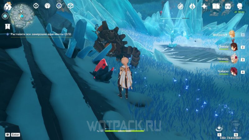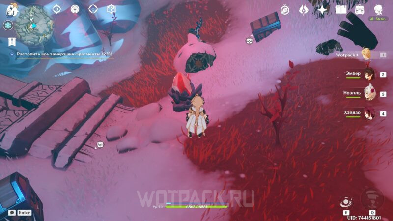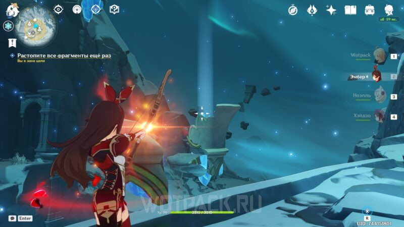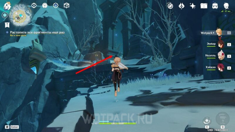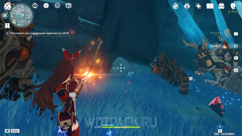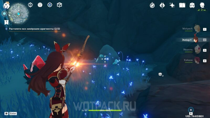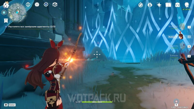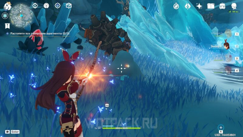 Чтобы каждый раз не подниматься к самим ледяным фрагментам, используйте лучника. Подберите алый кварц и, используя его, выстрелите заряженной атакой из лука в лед.