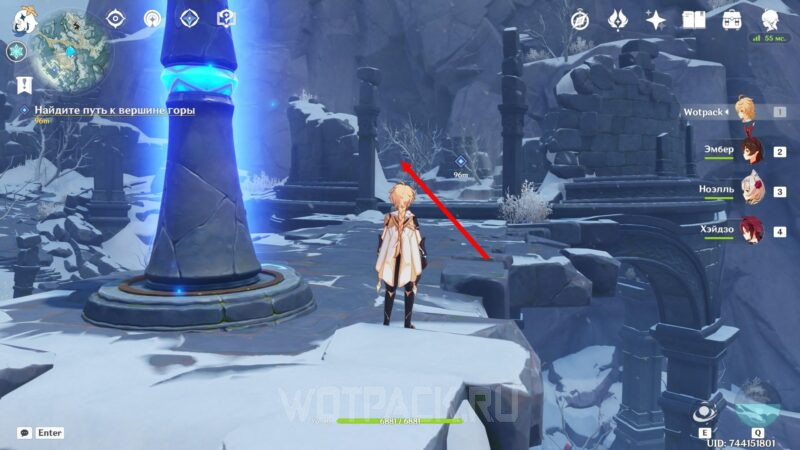 После этого элементальный монумент разблокируется, и его нужно активировать Анемо стихией. Далее поднимитесь на появившемся ветряном потоке выше, пролетите через кольца и медленно вскарабкайтесь на вершину огромной колонны.