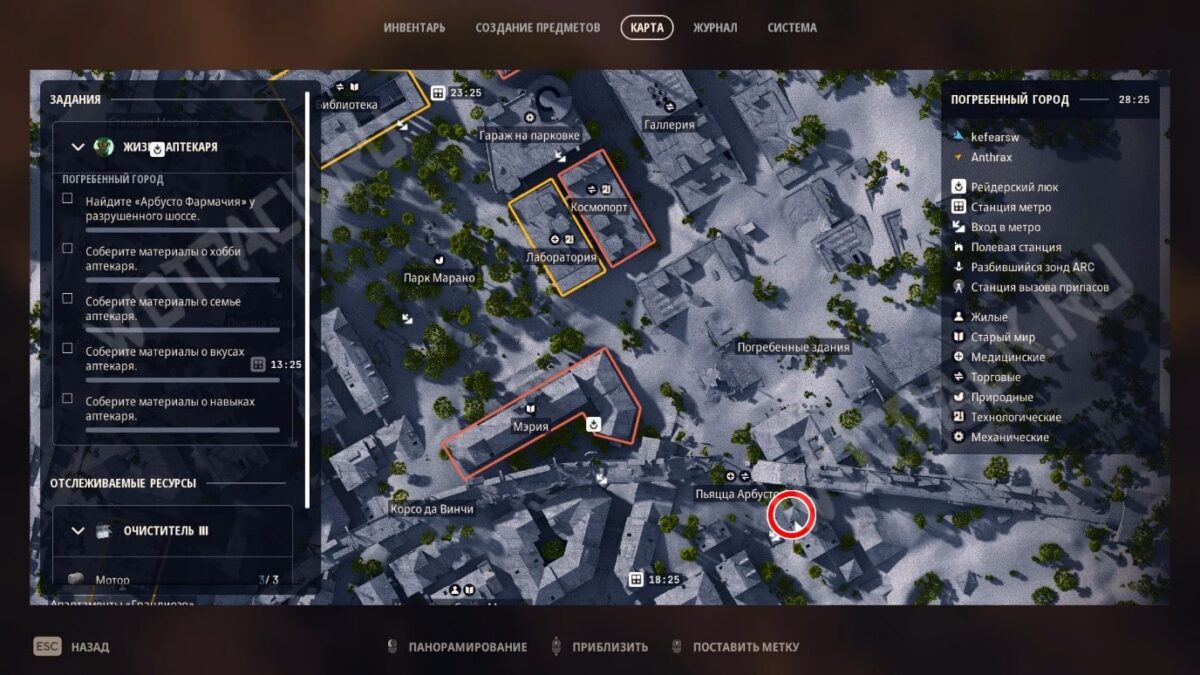Приняв задание, отправляйтесь в Погребённый город и найдите «Арбусто Фармачия» у разрушенного шоссе. Внутри заброшенной аптеки нужно задокументировать четыре объекта, рассказывающих о жизни владельца заведения.