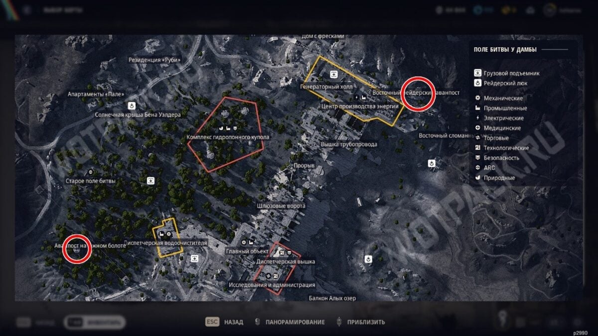 Рейдерская точка с видом на озёра тоже подписана на карте, но называется «Восточный рейдерский аванпост». Ищите её на северо-востоке локации, рядом с центром производства энергии. Внешне это такое же здание с башней, стоящее на скалах.