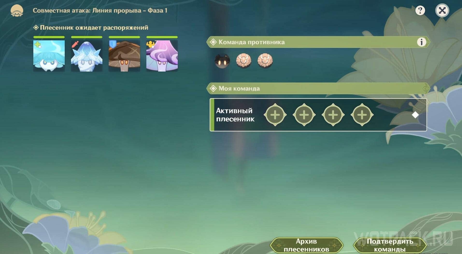 Плесенников стоит выбирать, исходя из противодействия врагам. На этом этапе не очень хорошо показывает себя Электро гриб, зато на 1 и 2 фазе в команду здорово впишется Крио плесенник. Однако строгой необходимости в определенном грибе в отряде нет, главное продолжать соблюдать формулу построения тимы.