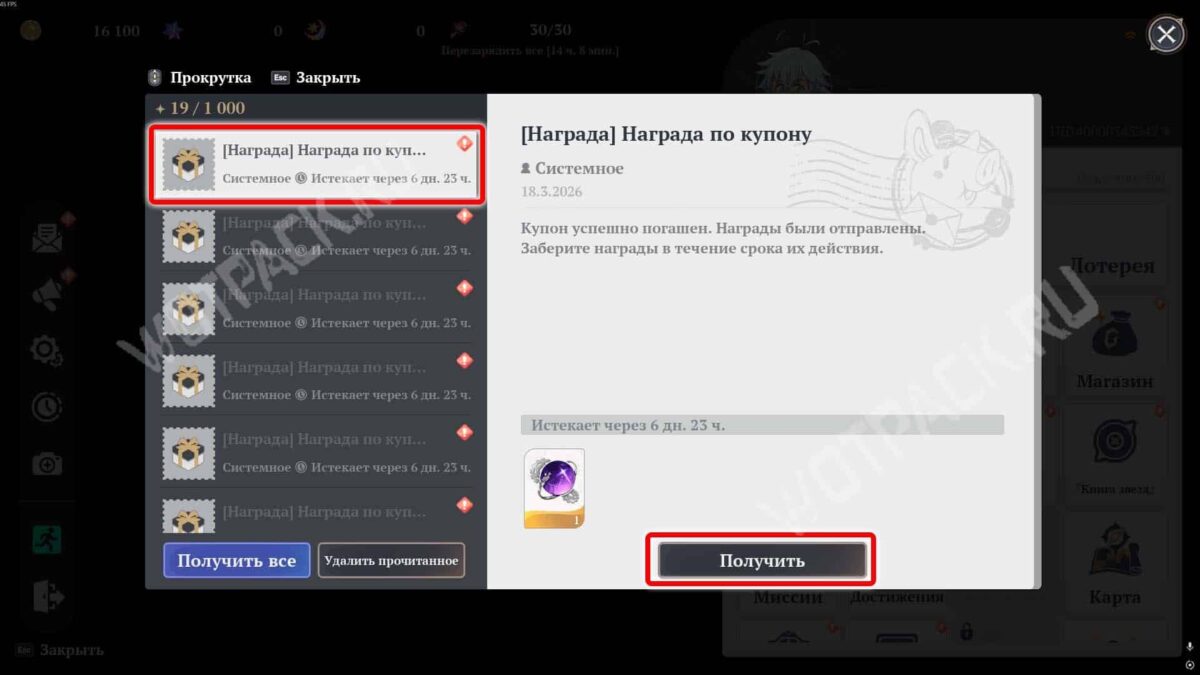 Призы приходят на игровую почту сразу после применения кода. Забрать их можно в течение 7 дней после получения письма. Не откладывайте сбор наград, иначе они будут удалены. Вернуть их через разработчиков не удастся, так как купон будет считаться использованным.