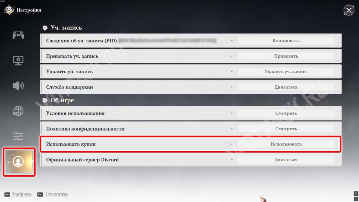 - Выберите справа последний раздел «Учетная запись» и внизу списка нажмите «Использовать купон».