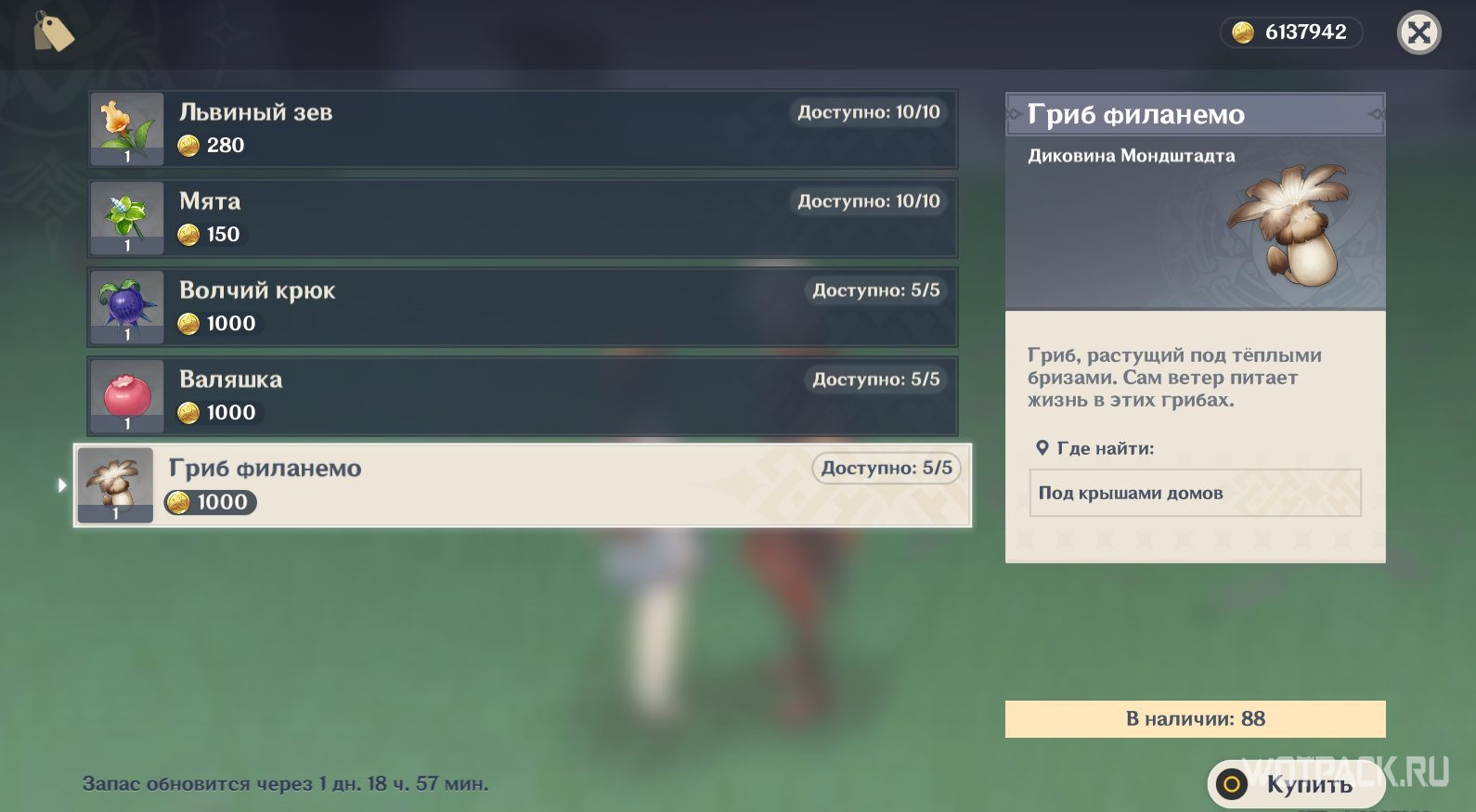 Один гриб стоит 1000 моры. Следовательно, полноценная покупка обойдется в 3000 монет.