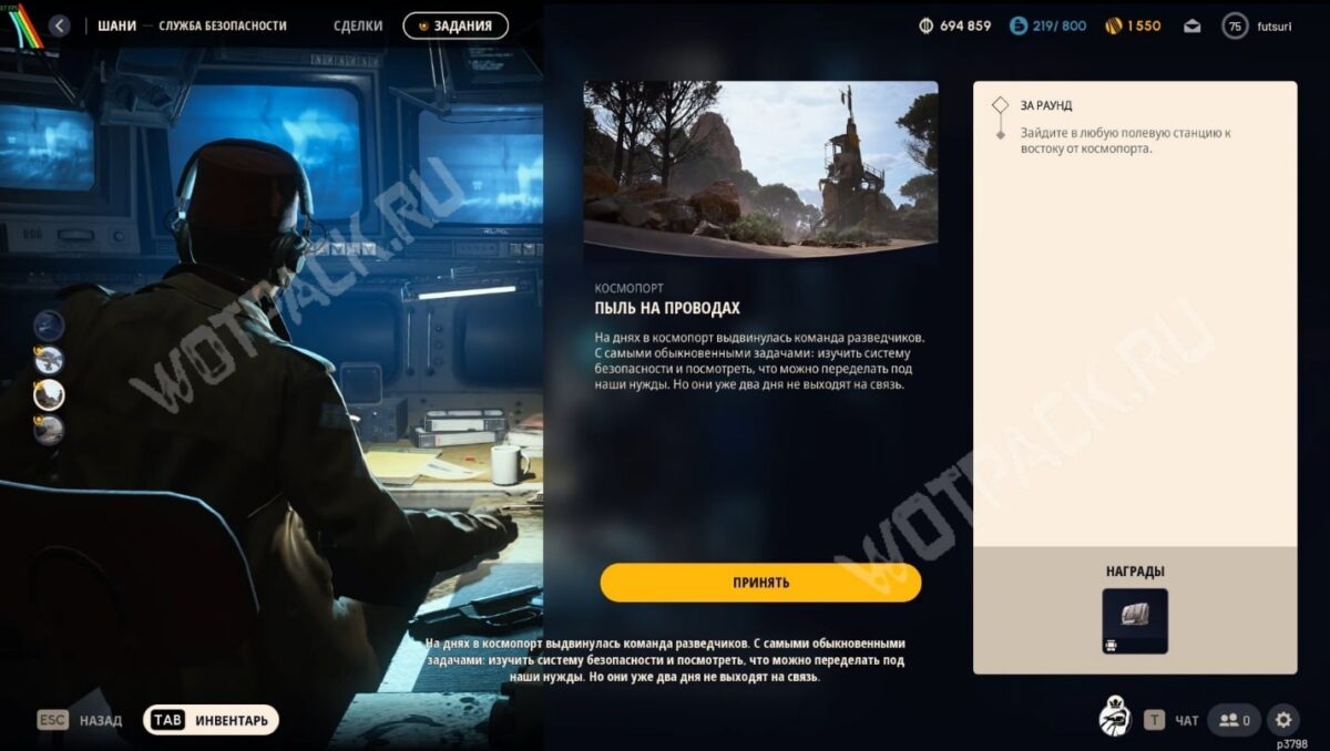 Все этапы поручения нужно выполнить за один забег. На базу предстоит вернуть квестовый предмет, поэтому в вылазку лучше идти с собственным снаряжением и положить вещь в потайной карман. Также стоит убедиться, что на Космопорте не проходят события, чтобы не столкнуться с лишними трудностями.