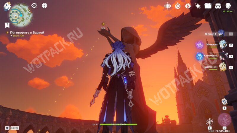 Вернувшись в Мондштадт, поговорите с Варкой, расположившимся на руках статуи Анемо Архонта. Поднимитесь к другу и проведите остаток вечера за разговорами.
