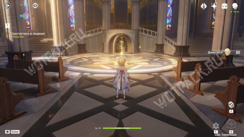 Забрать реликвию не получится — как и в прошлый раз её украдут прямо на глазах Путешественника. Покинув собор, преследуйте сбежавшую «Фатуи» по воздуху, а затем бегите за ней вслед к озеру у Спрингвейла.