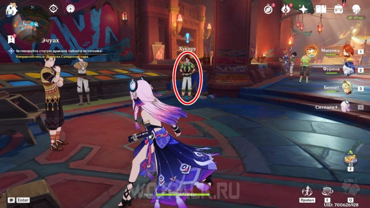 Выдающий посылку персонаж появляется после завершения 5 главы 5 тома заданий Архонтов «Пылающая Ода воскресения» в Натлане. Отправляйтесь на стадион Священного Пламени к телепорту рядом с Катериной. Хукиру стоит недалеко от точки перемещения и помечен квестовым восклицательным знаком.