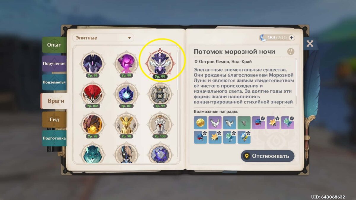 - Мерцание/сияние/слава морозной ночи – это материалы, выпадающие после победы над Потомками морозной ночи. Они являются элитными противниками, обитающими на территории Нод-Края. Обычно встречаются по одиночке.
