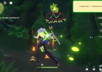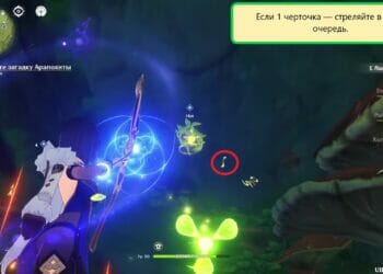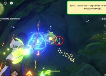 После разговора возле каждой надписи возникнут Дендро мишени. Возьмите любого лучника (например Эмбер, Коллеи) и взаимодействуйте с Дендрогранумом неподалеку. С его помощью расстреляйте мишени в правильном порядке.