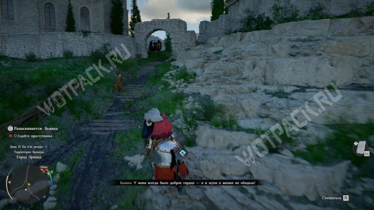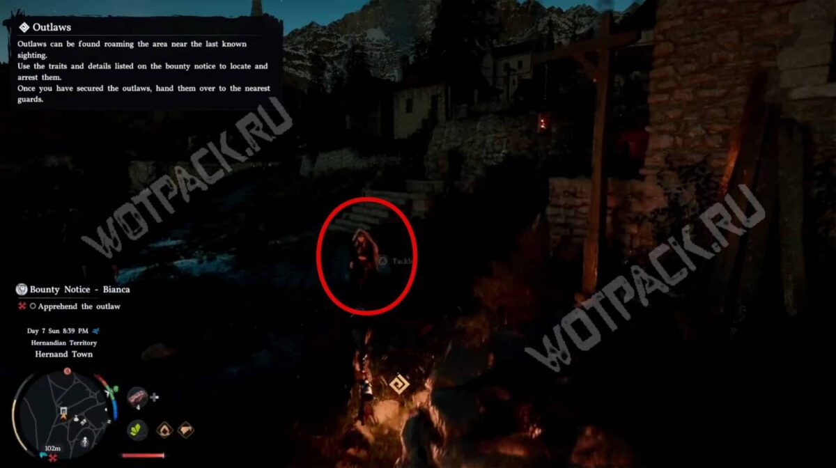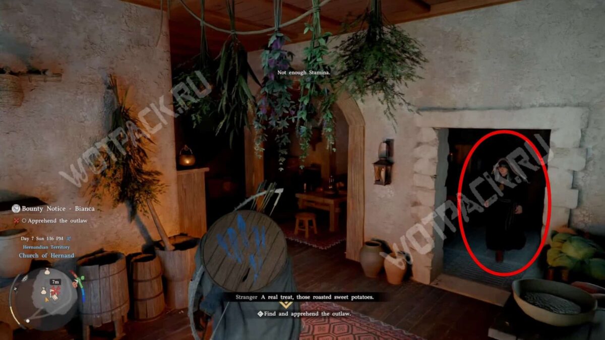 В зависимости от того, где увидите преступницу, она или выскочит из кухни, или побежит на дорогу, ведущую на север. Во втором случае можете наткнуться на разбойников, которых сначала придётся убить, потому что они будут мешать поимке.