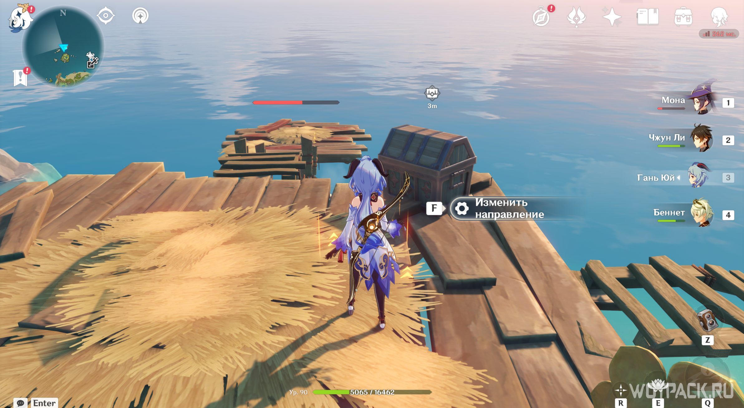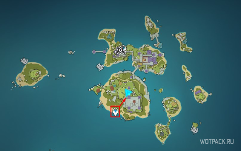 Переместитесь на остров и спуститесь к югу. Внизу будет видна платформа с сундуком, а вокруг 4 факела.
