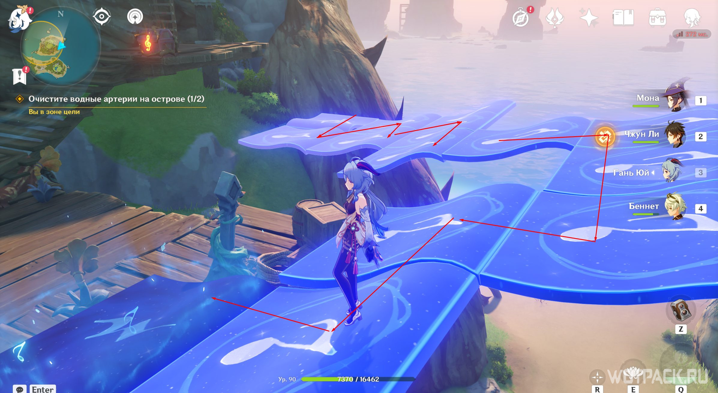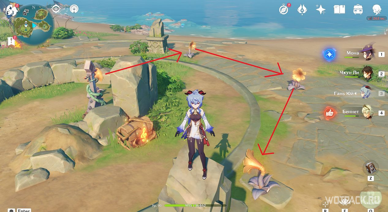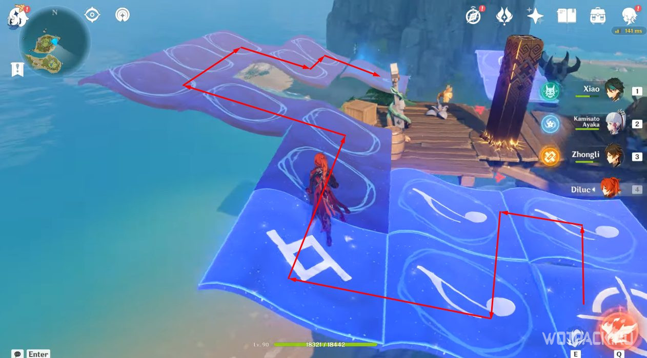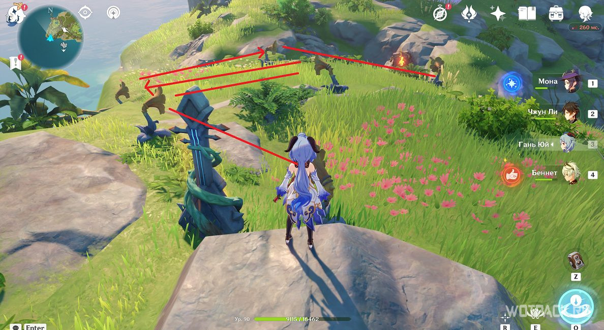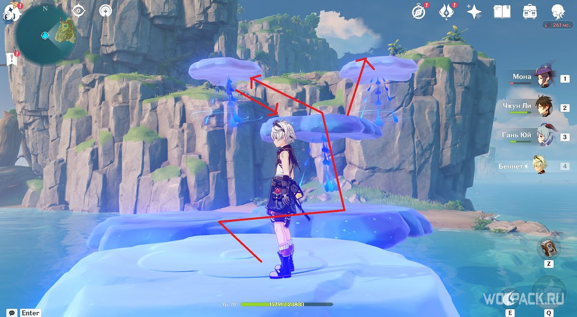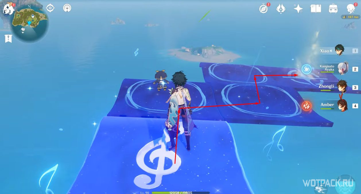 Взаимодействуйте с монументами стихией Анемо в том порядке, который указан на скриншоте. Для активации подойдут Сахароза, Хэйдзо и другие Анемо герои.