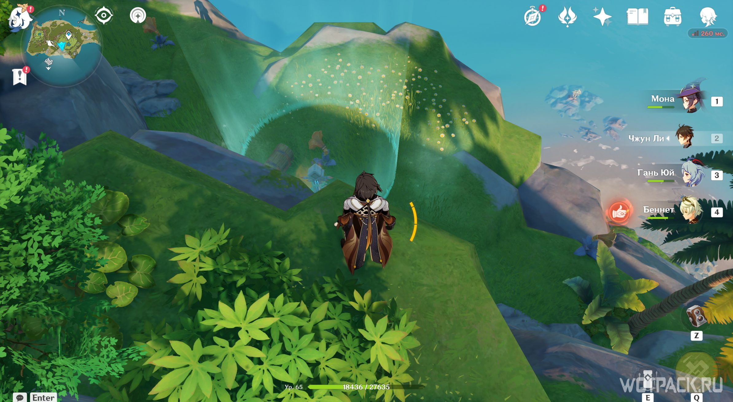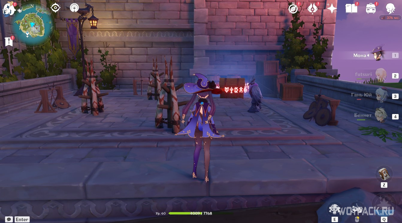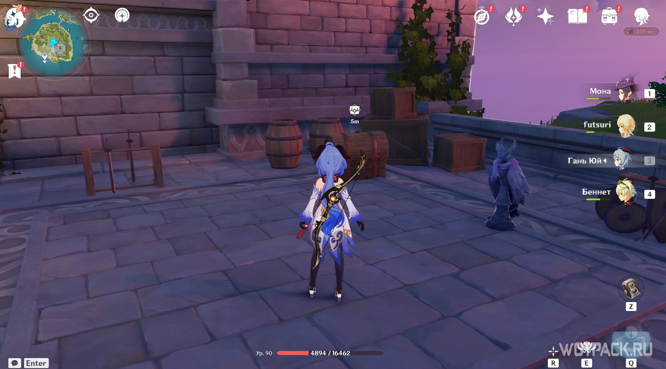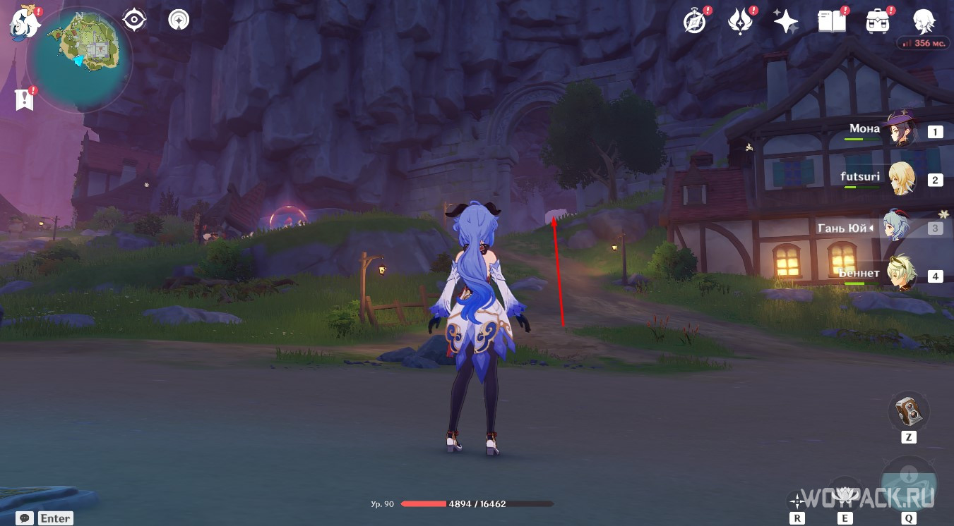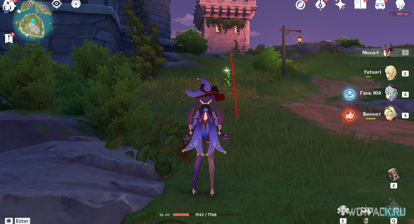 Впереди находится ветряная мельница — используйте на ней Анемо стихию, чтобы активировать ветряной поток и подняться до Пиро тотема слева на возвышенности. Затем спрыгните вниз к обрыву и зажгите Анемо и Крио монументы. Вернитесь к мельнице и на потоке ветра поднимитесь к последнему Гидро тотему на каменной арке справа.