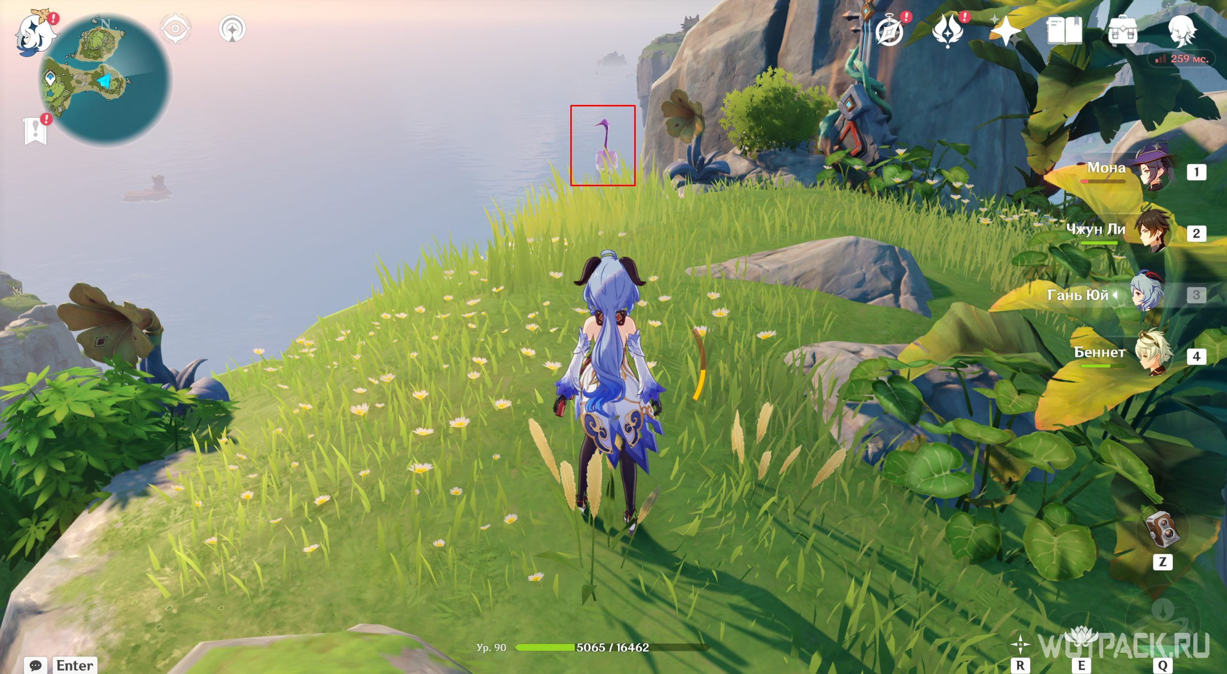 За сопровождение этого фиолетового журавля можно получить сразу два сундука. Доплывите до острова на волноходе и заберитесь на облачную ступень с птицей.