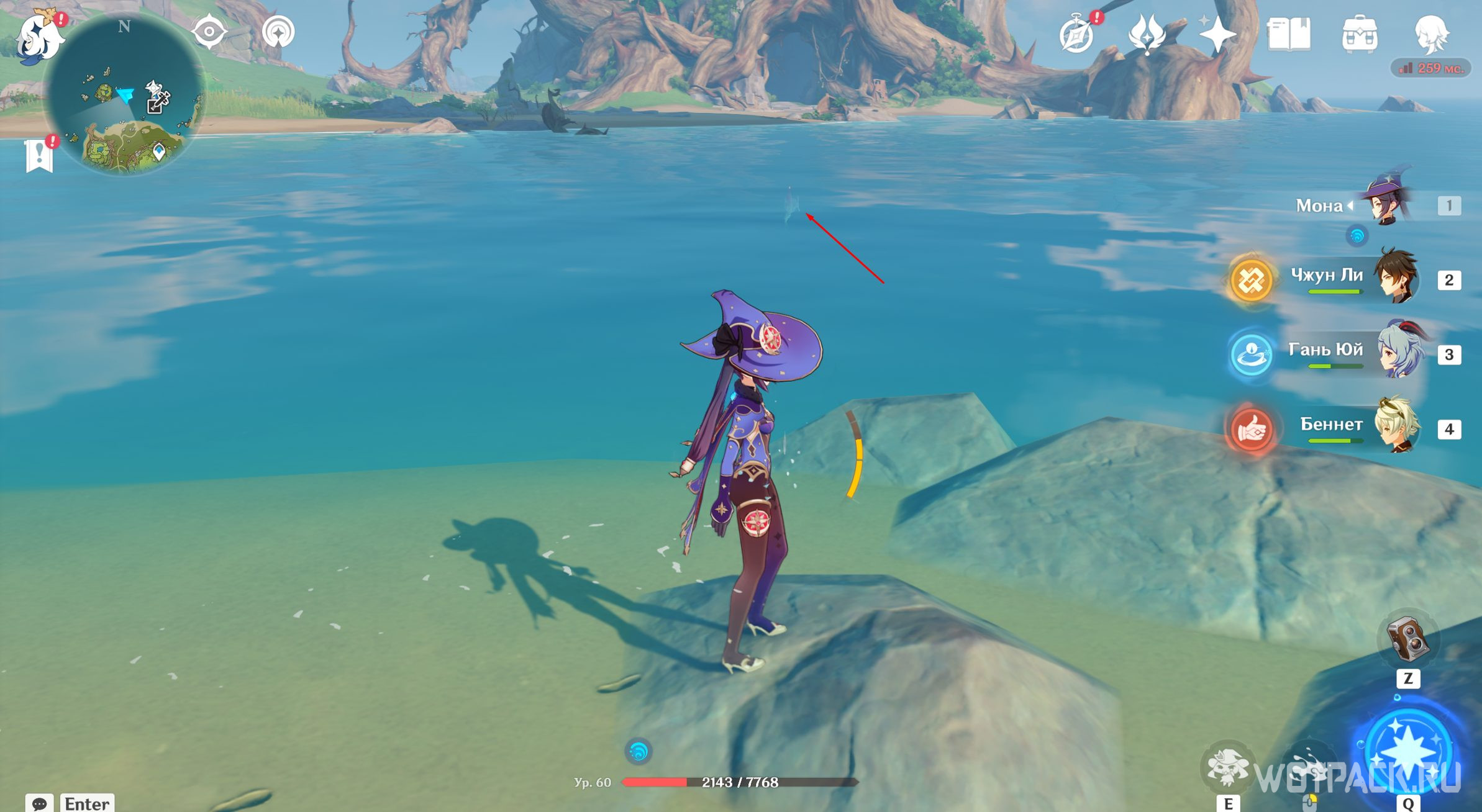 Измените вид Опасного острова на его мистическую версию и поднимитесь ко второму пруду Моны. Встаньте в него и Опустите в воду.
