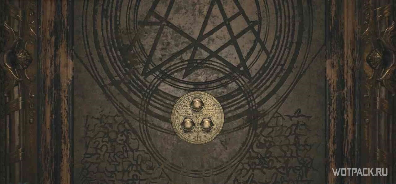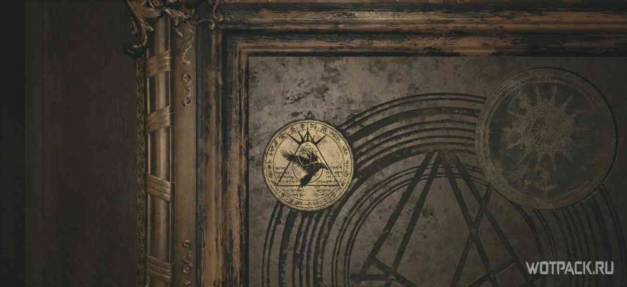 Это довольно простая загадка, но в череде других секретов она может сбивать с толку. Итан должен взять ножницы в коридоре рядом с кабинетом и разрезать там повязки. Далее нужно поднять телефон в следующем коридоре. Затем необходимо вернуться в кукольную, разрезать повязки на кукольном сундуке ножницами и вытащить латунный медальон. Медальон помещается в дверь с 3 вращающимися символами. Верхний левый символ заменяется на летящего ворона, смотрящего в сторону, а нижним символом должны стать 3 закрытых глаза. Скриншоты пояснят, как это должно выглядеть в итоге.