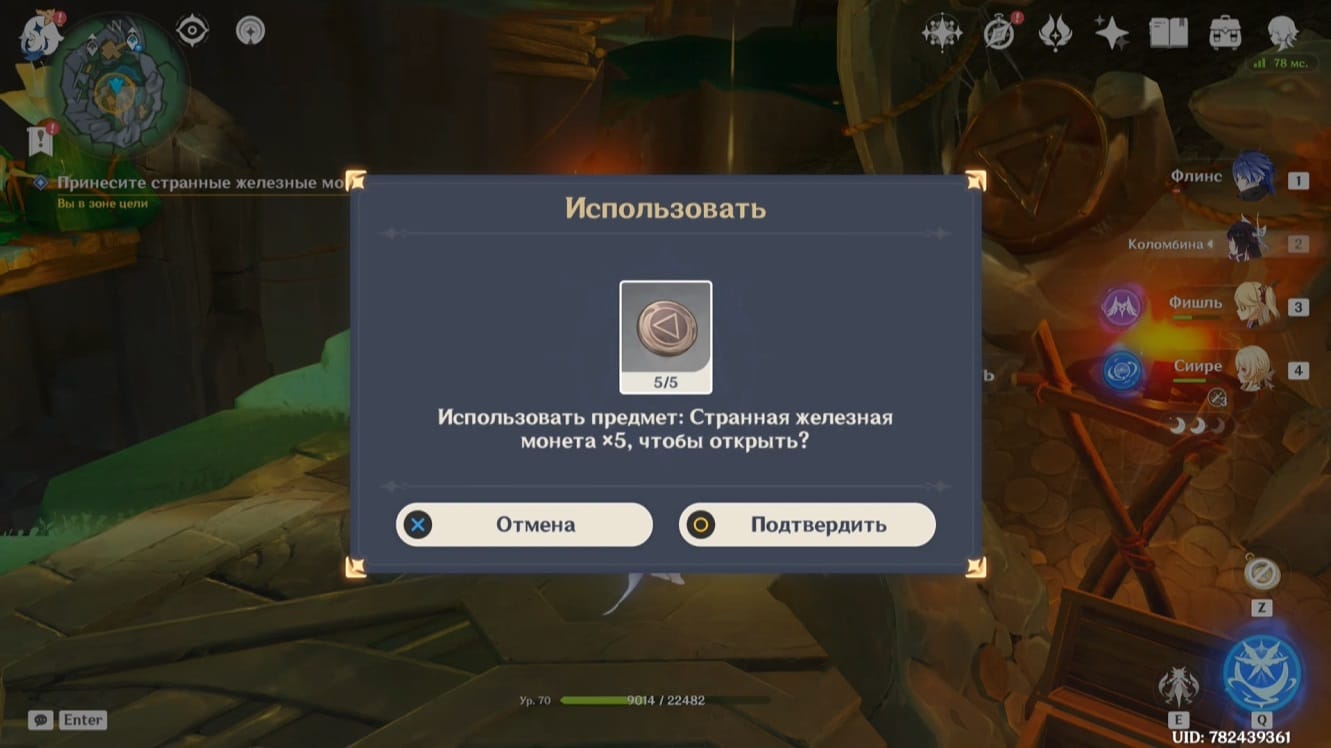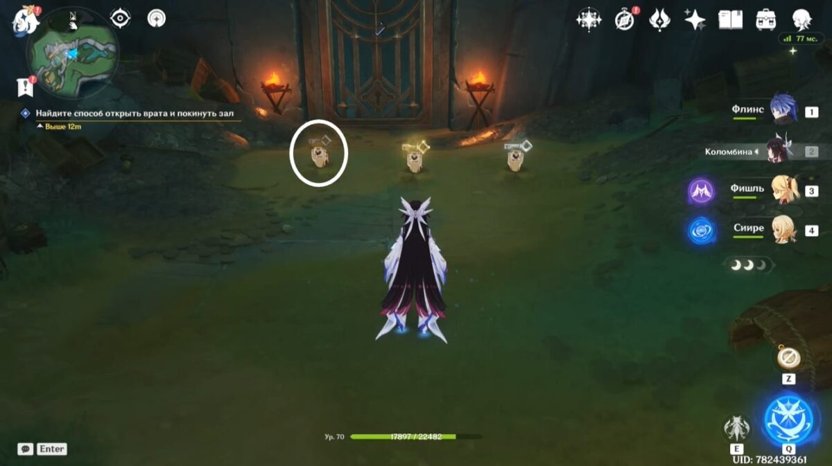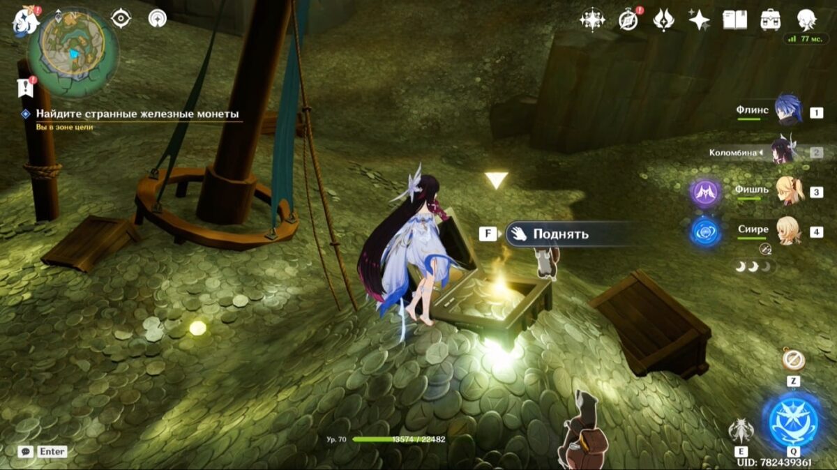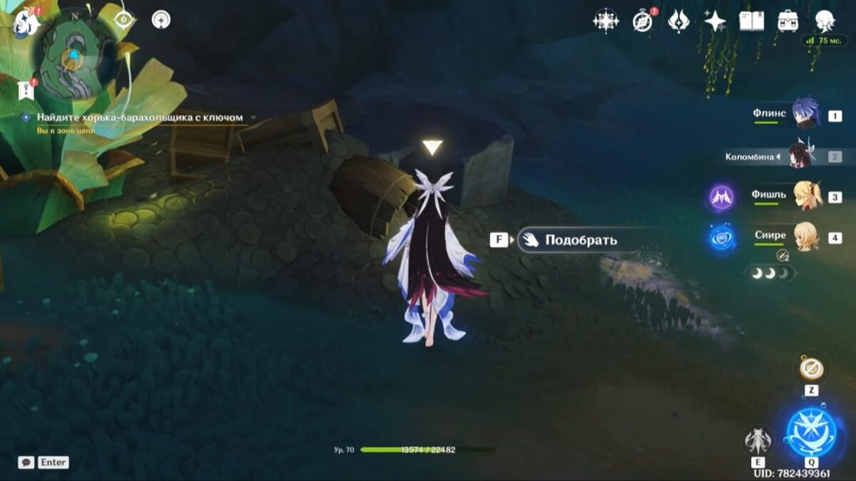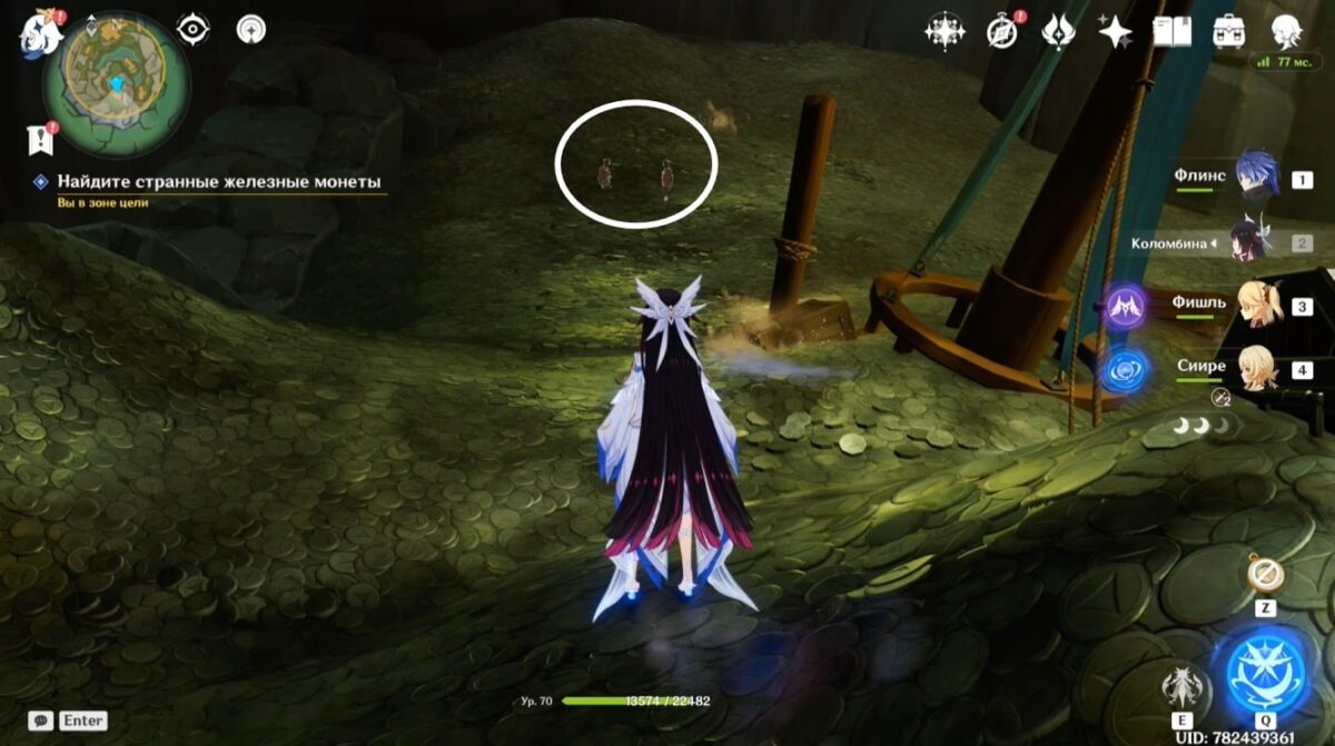 - Подберите монету, тогда элементальное умение персонажа заменится на особый навык из трёх зарядов. Зажмите E-скилл и, прицелившись, бросьте предмет в убегающее создание. Остановив его, сможете забрать ключ.