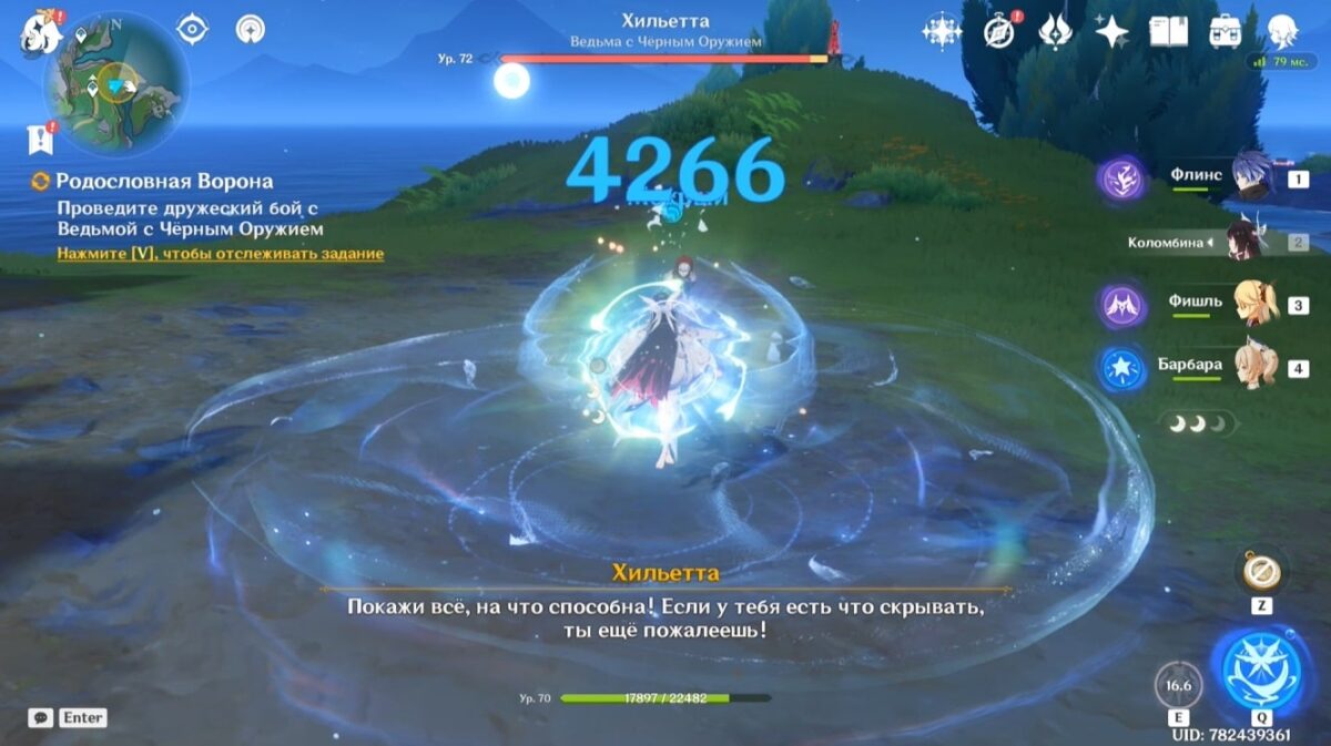 Похитительница сокровищ, впечатлённая упорством Путешественника, попросит показать его истинную мощь в дружеском поединке. Победите Хильетту «Ведьму с Чёрным Оружием», используя любой сильный отряд. Против её механик лучше составлять команду из Электро, Крио и Гидро персонажей, но она слабее своей версии как босса, поэтому это не обязательно.