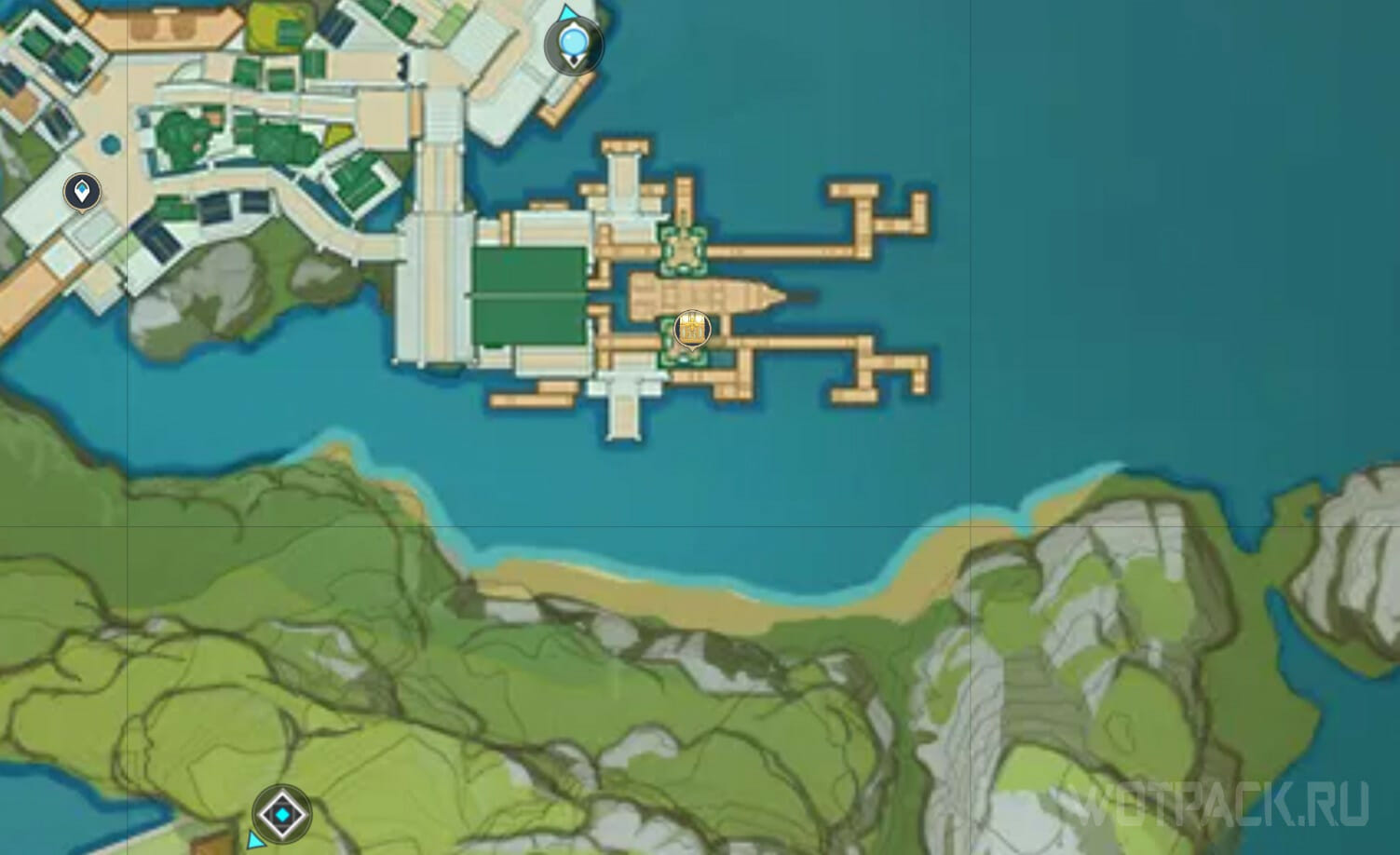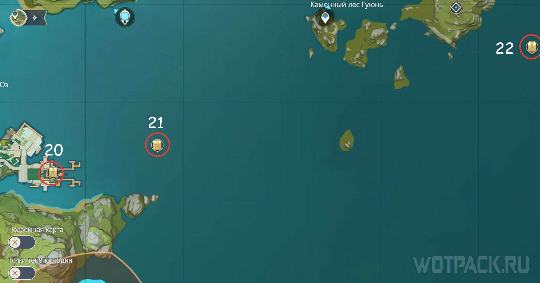 Телепортируйтесь к подземелью в Каменном лесу Гуюнь и пробегите к острову, который расположен немного западнее. На нем находятся четыре стража руин. Победите их, чтобы получить сундук.