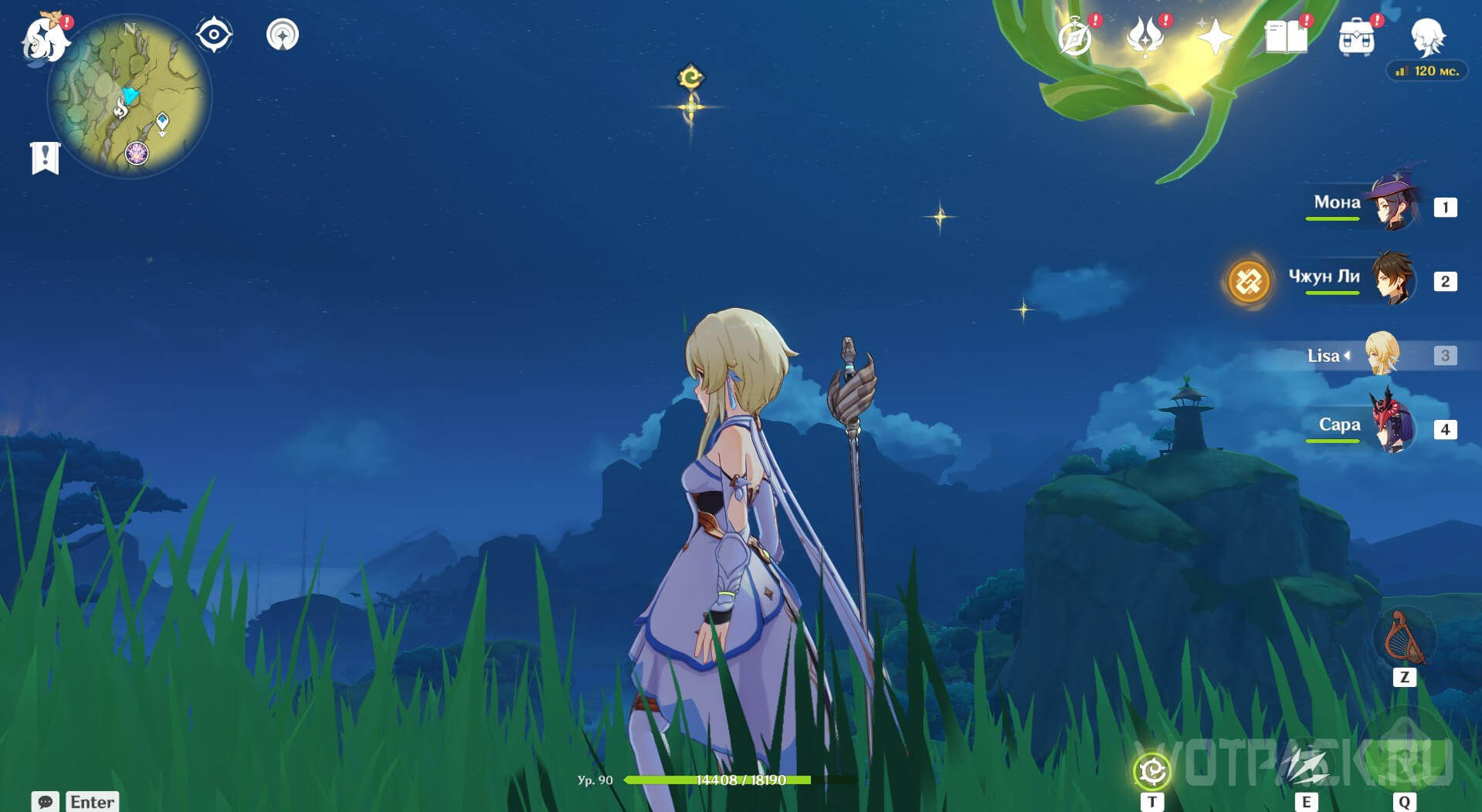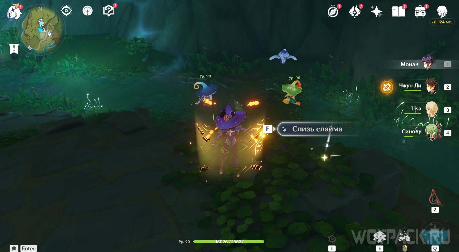 Далее на этом месте окажется мята под барьером, а над ней 2 объекта. Атакуйте их с помощью дендрогранума. Поднимите мяту и победите Пиро попрыгунью. Затем с помощью четырехлистного символа летите на гору с домиком, слева будет сундук.