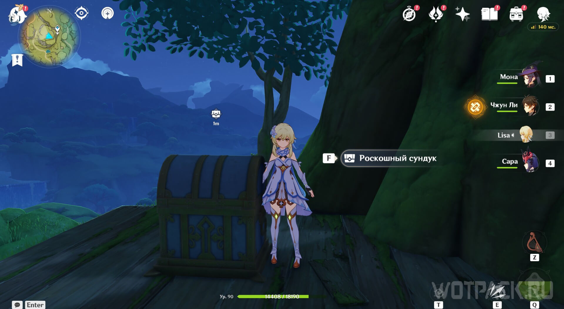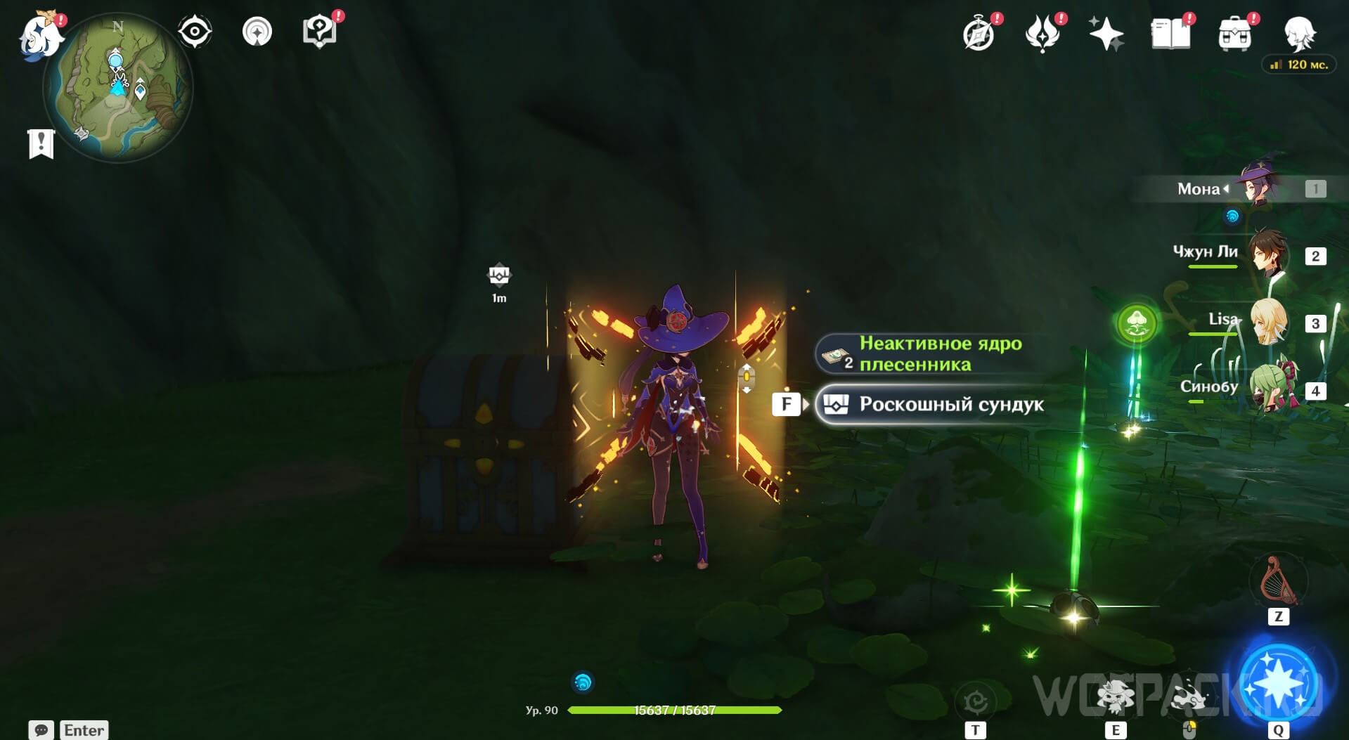 Следующую награду можно получить только после открытия телепорта в задании Спуск в Пещеру дэва из большой цепочки квестов Винама-агама. Около путевой точки спуститесь вниз и победите всех Гидро, Анемо и Гео слаймов. Когда враги будут уничтожены, появится 3 плесенника, их тоже нужно уничтожить, чтобы появился роскошный сундук.