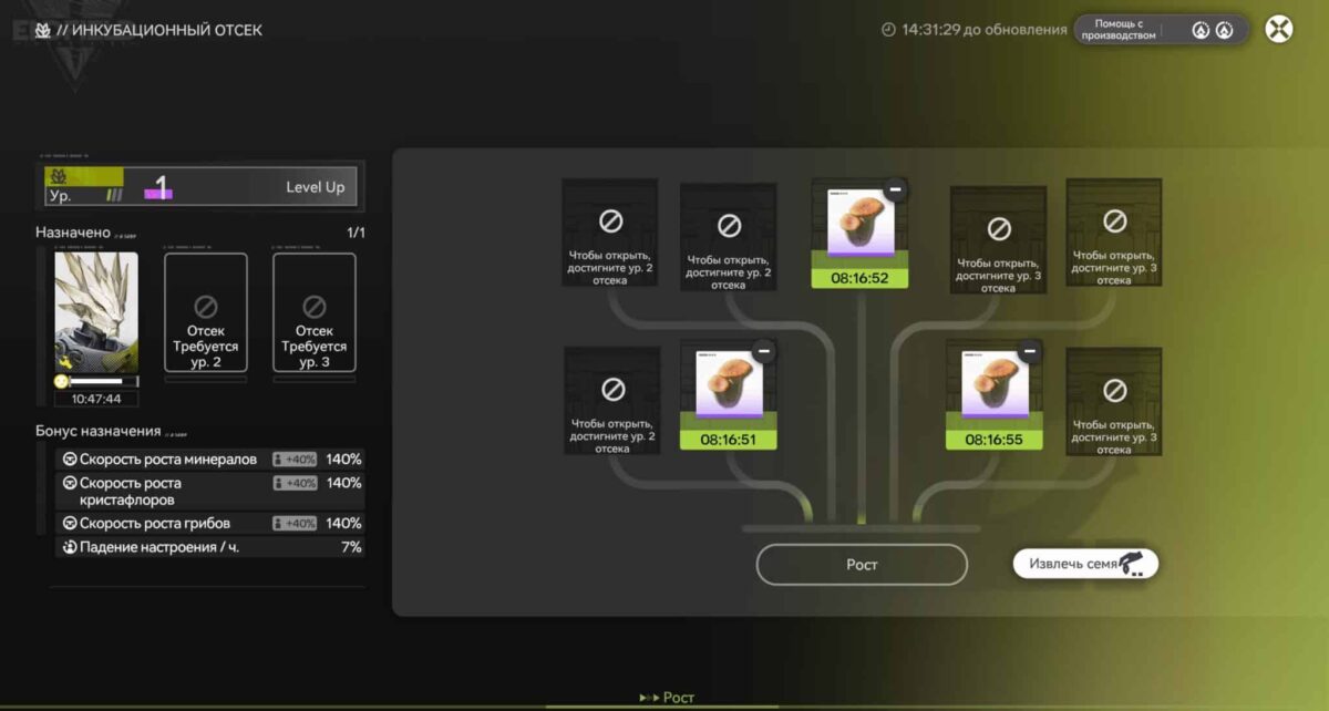 Улучшив нексус на ОМК Дицзян до второго уровня и построив помещение для производства материалов, сможете использовать Инкубационный отсек. Закрепив культуру за аппаратом и назначив исполнителя, начнёте извлекать семена и полноценно заниматься садоводством.