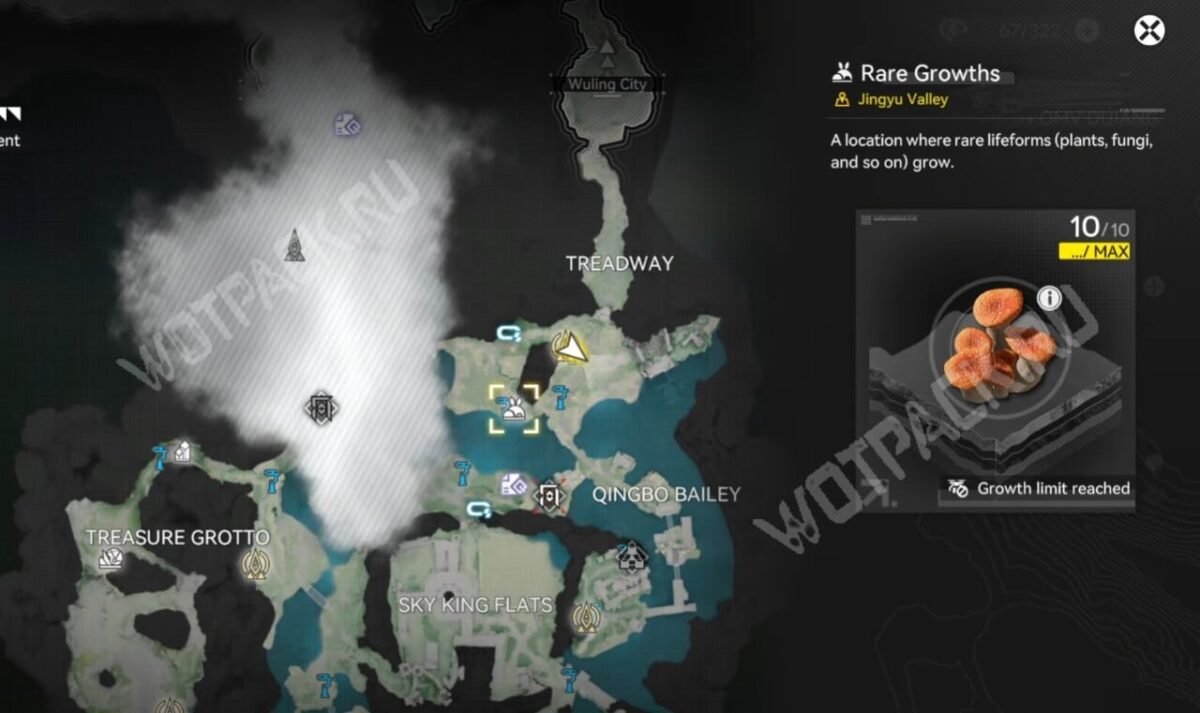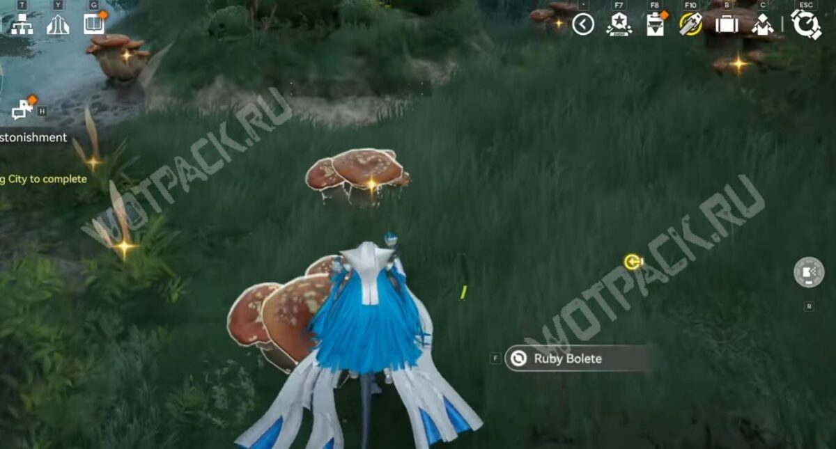 Рубиновый гриб растет только в регионе Улин, у водоема на севере от Равнины небесного царя. Материал можно собрать с двух сторон: на побережье под Протоптанным путем и у реки на юге от Станции экологических исследований. На каждом споте растёт по 10 единиц этого расходника.
