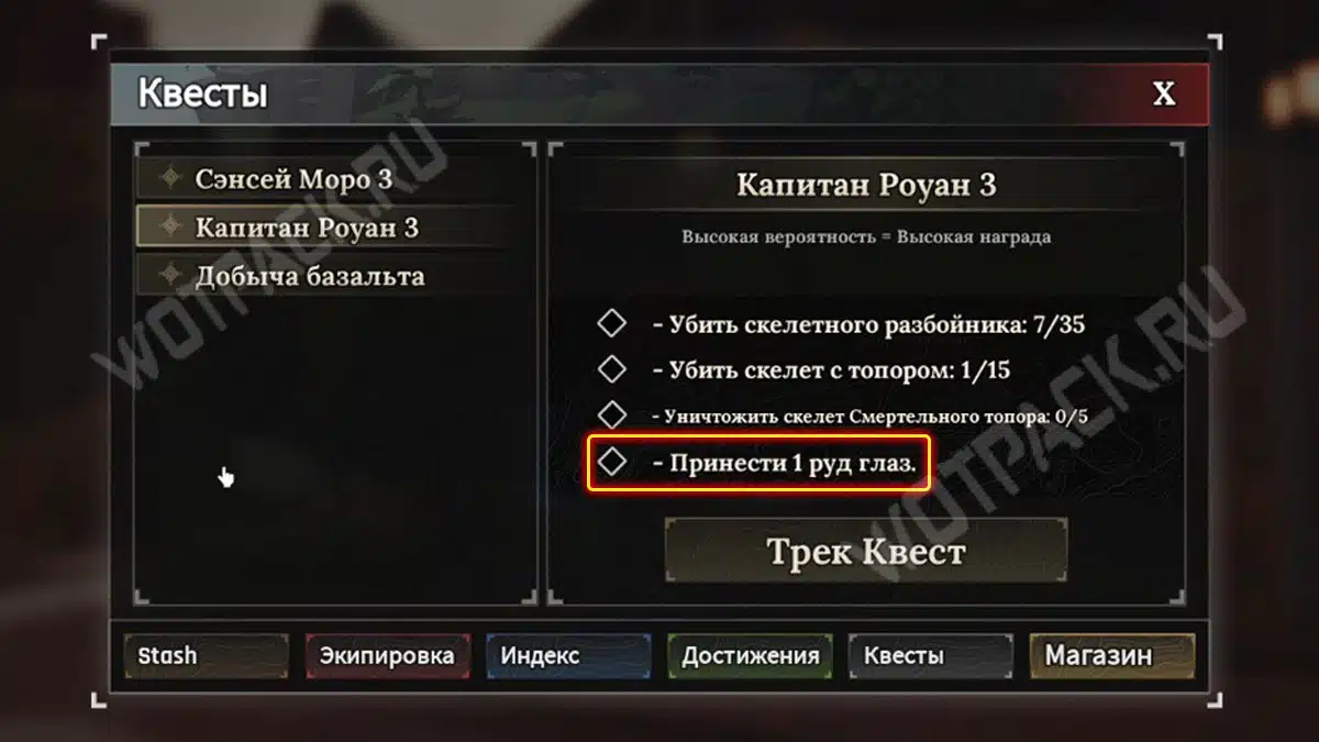- В Забытом царстве для квеста «Капитан Роуан 3» требуется принести один руд глаз.