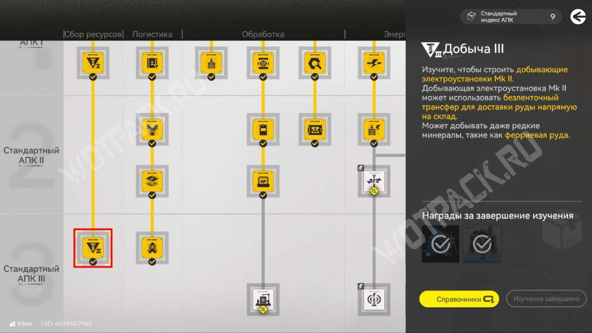 Из них самой совершенной является «Добывающая ЭУ Mk II» — эта вышка может разрабатывать залежи феррия наравне с аметистом и ориджинием, а также автоматически направлять материалы на склад. Чтобы открыть её, пройдите миссию «Загадочное происшествие в здании» и изучите технологию «Добыча III» в производственном плане АПК.