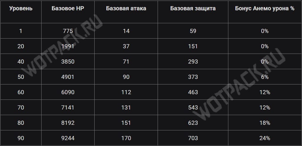 Основной стат, который повышается при прокачке, — бонус Анемо. Помимо него, увеличиваются такие характеристики, как здоровье, атака и защита. Тратить Блуждающую удачу на героиню не стоит, поскольку она саппорт, не зависящий от «врожденных» статов, и не получит прибавки даже к своим навыкам поддержки.