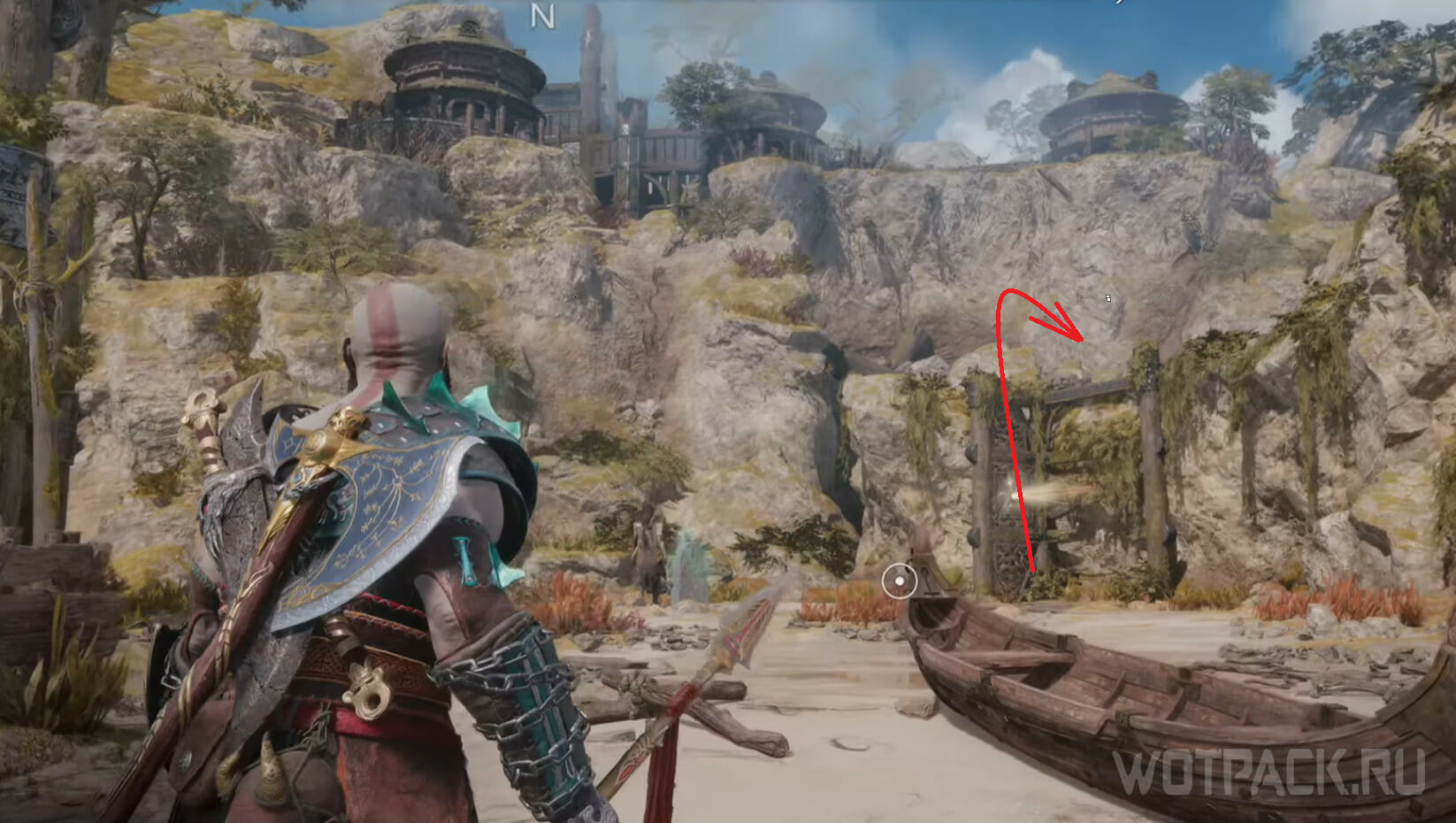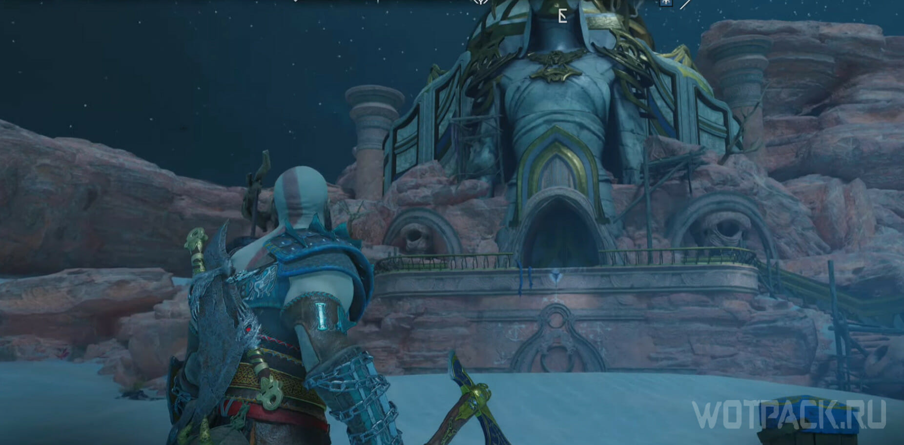 Выйдя на поверхность, пробегите вперед и воспользуйтесь цепью, чтобы подняться повыше. Пробегите прямо и спрыгните к месту у статуи. Кратос приземлится прямо у огромной цепи, на которой будет маркер взаимодействия. Подойдите к ней и потяните, чтобы открыть тайную комнату.