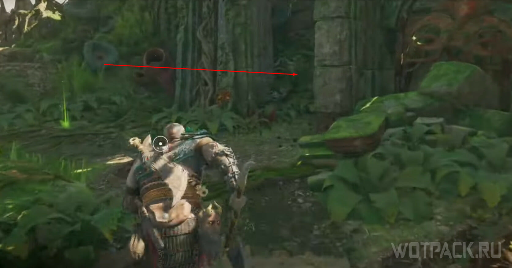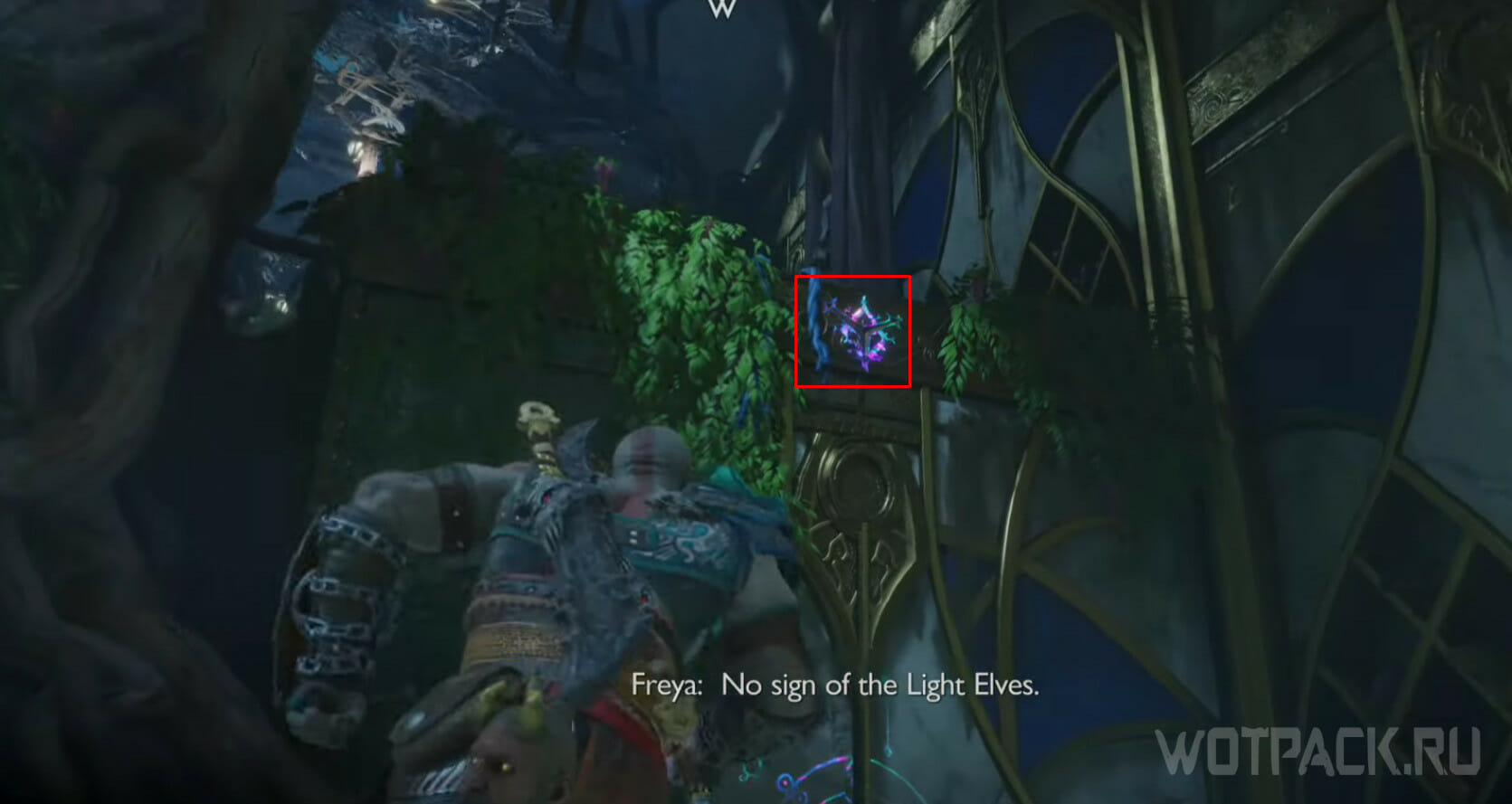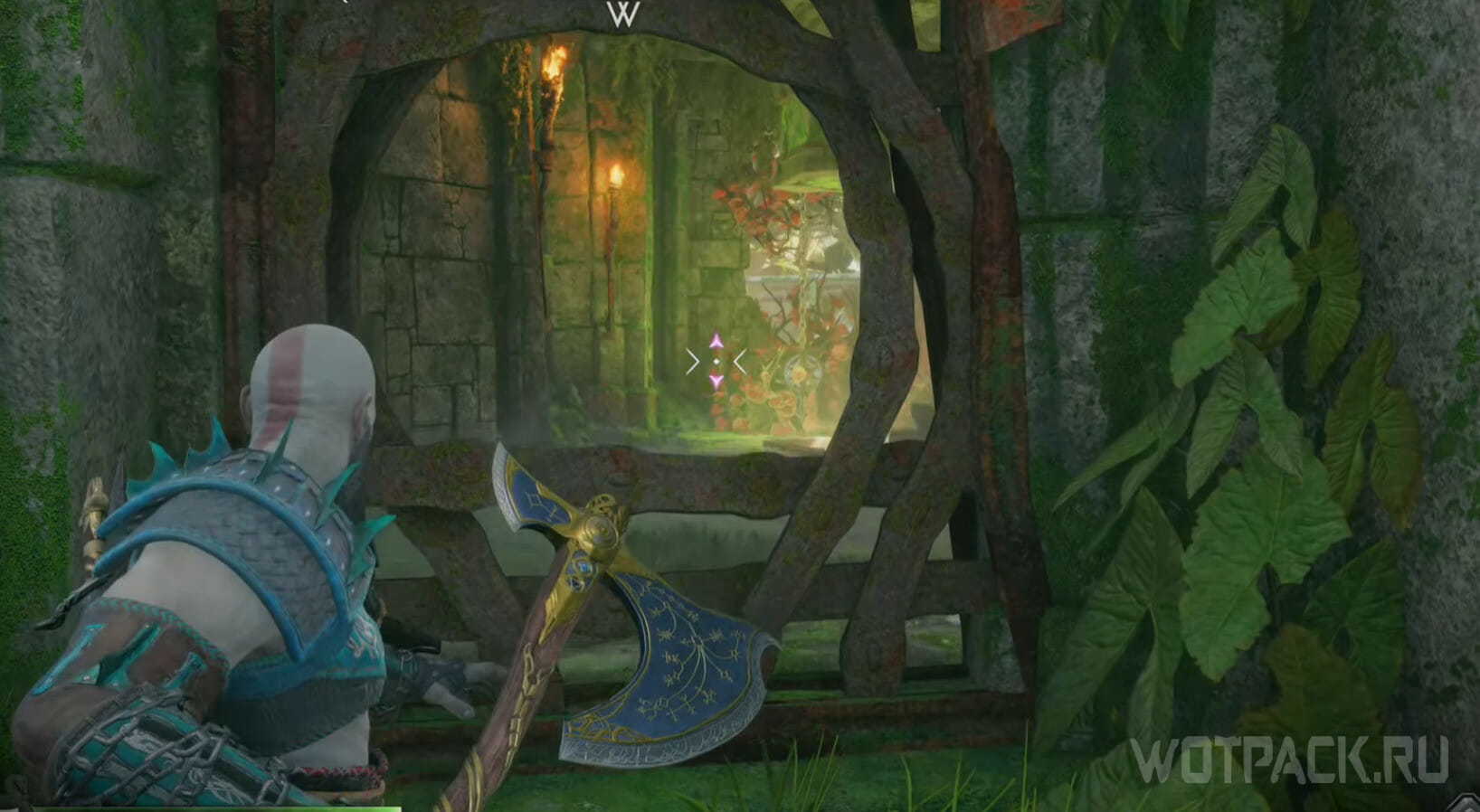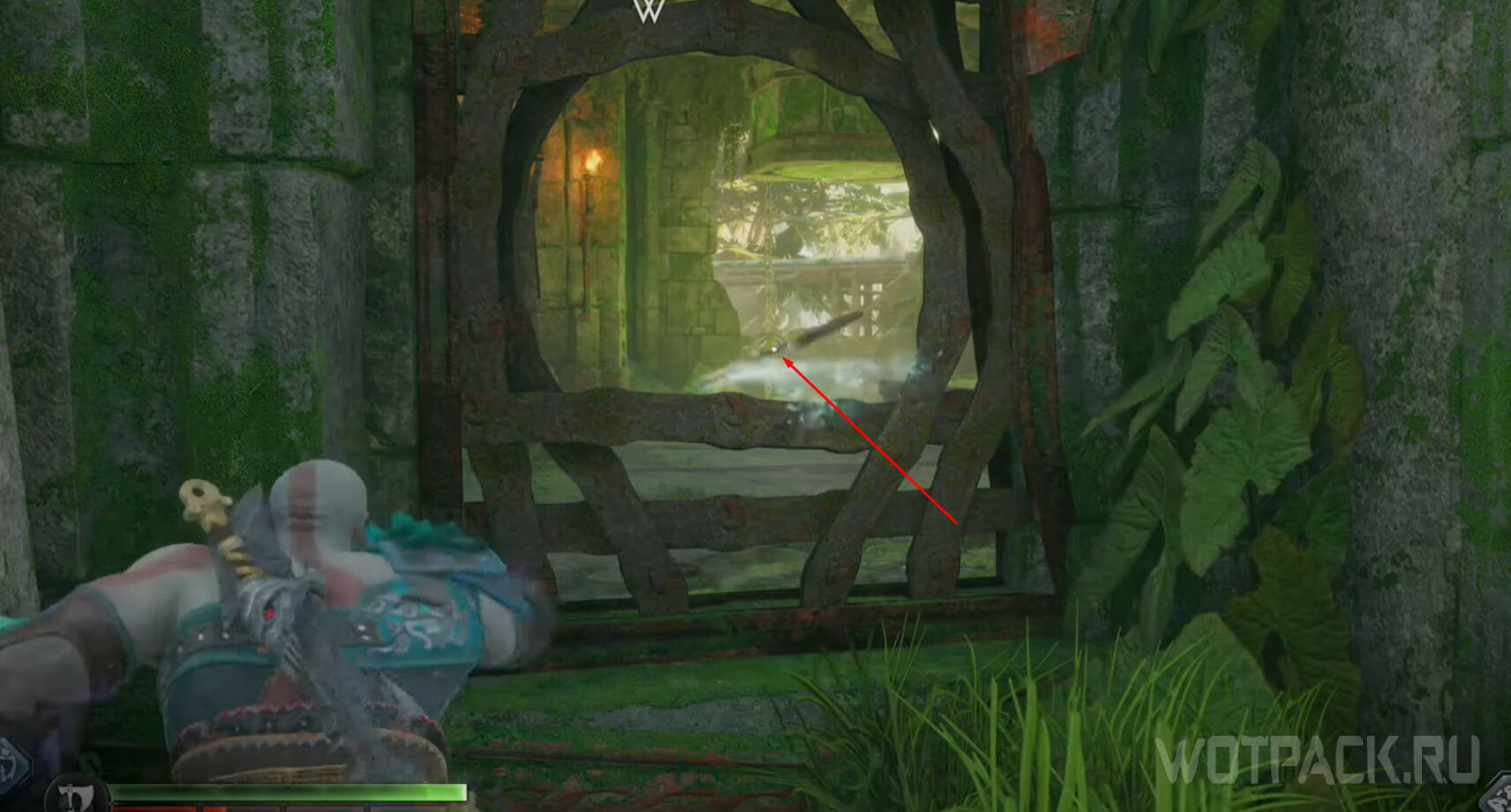Обойдите строение слева и подойдите к месту, где находится окно, из которого видна лоза. Попросите Фрейю выстрелить в стену несколько раз, чтобы появилась рунная печать. При помощи Клинков Хаоса подожгите ее и уничтожьте растения внутри.