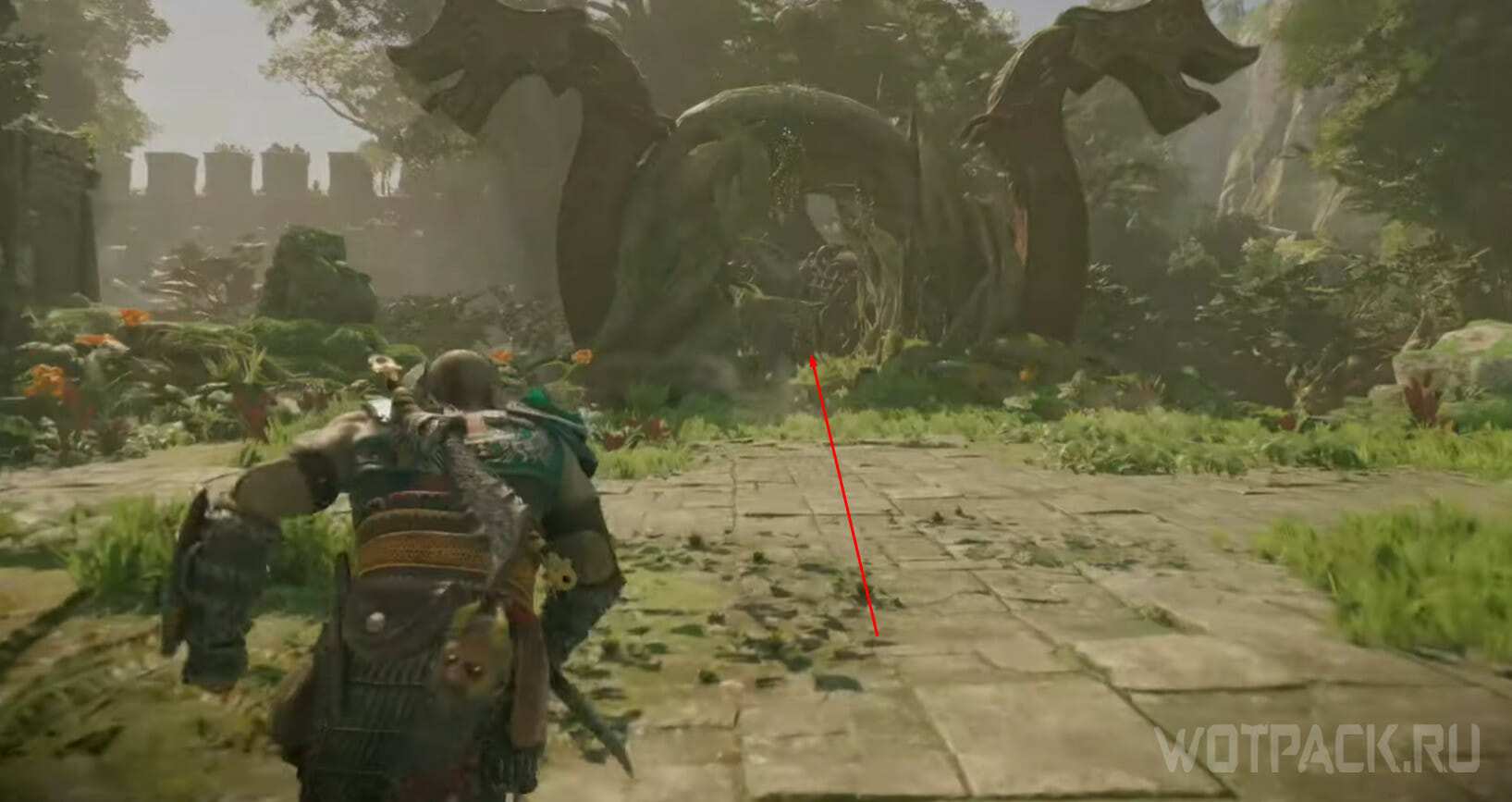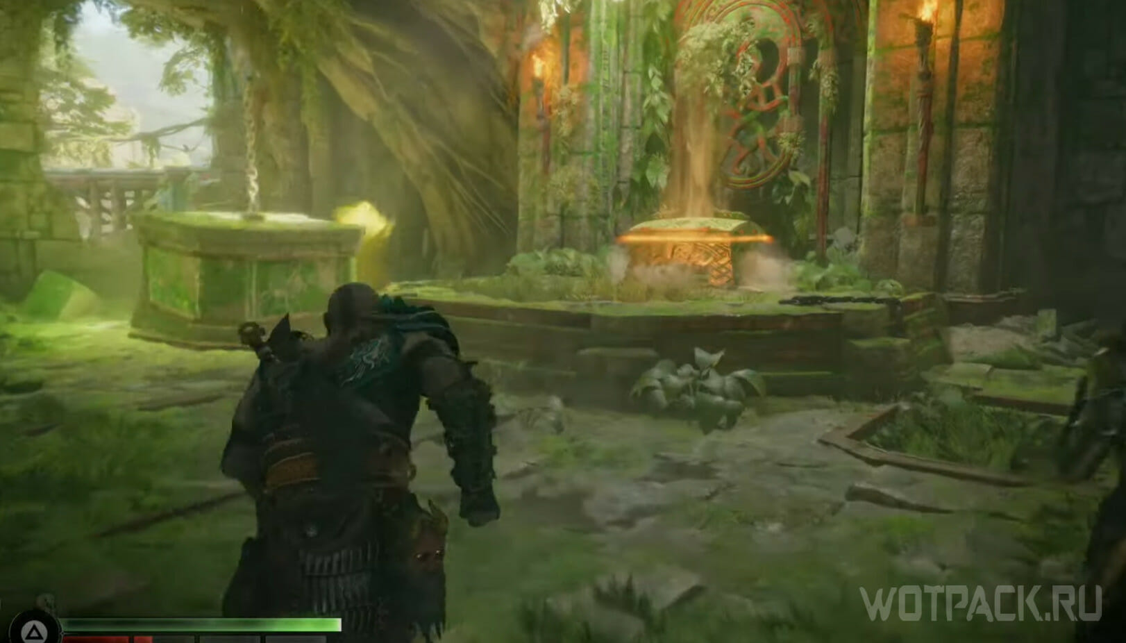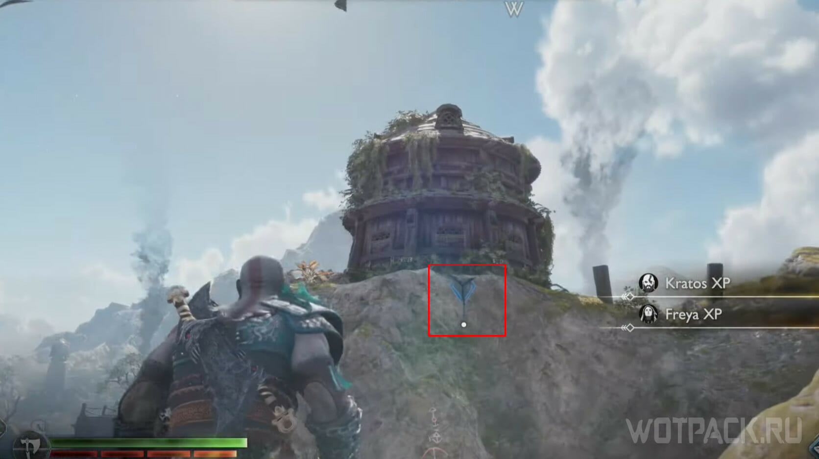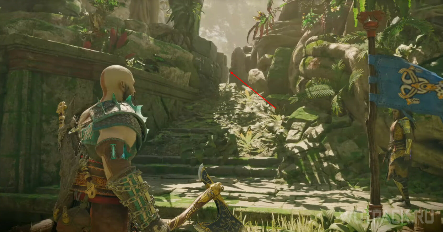 Обойдите строение слева и подойдите к месту, где находится окно, из которого видна лоза. Попросите Фрейю выстрелить в стену несколько раз, чтобы появилась рунная печать. При помощи Клинков Хаоса подожгите ее и уничтожьте растения внутри.