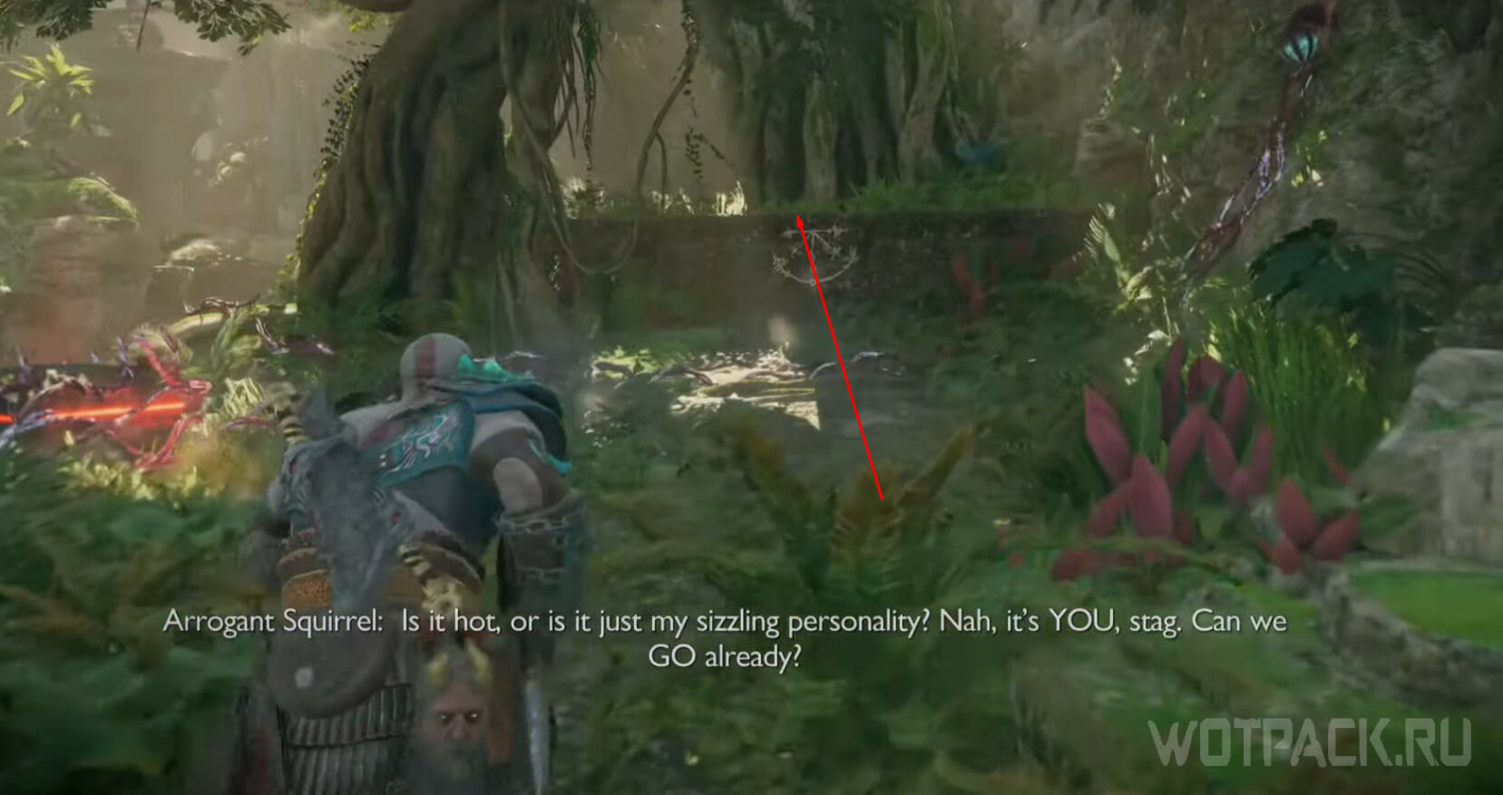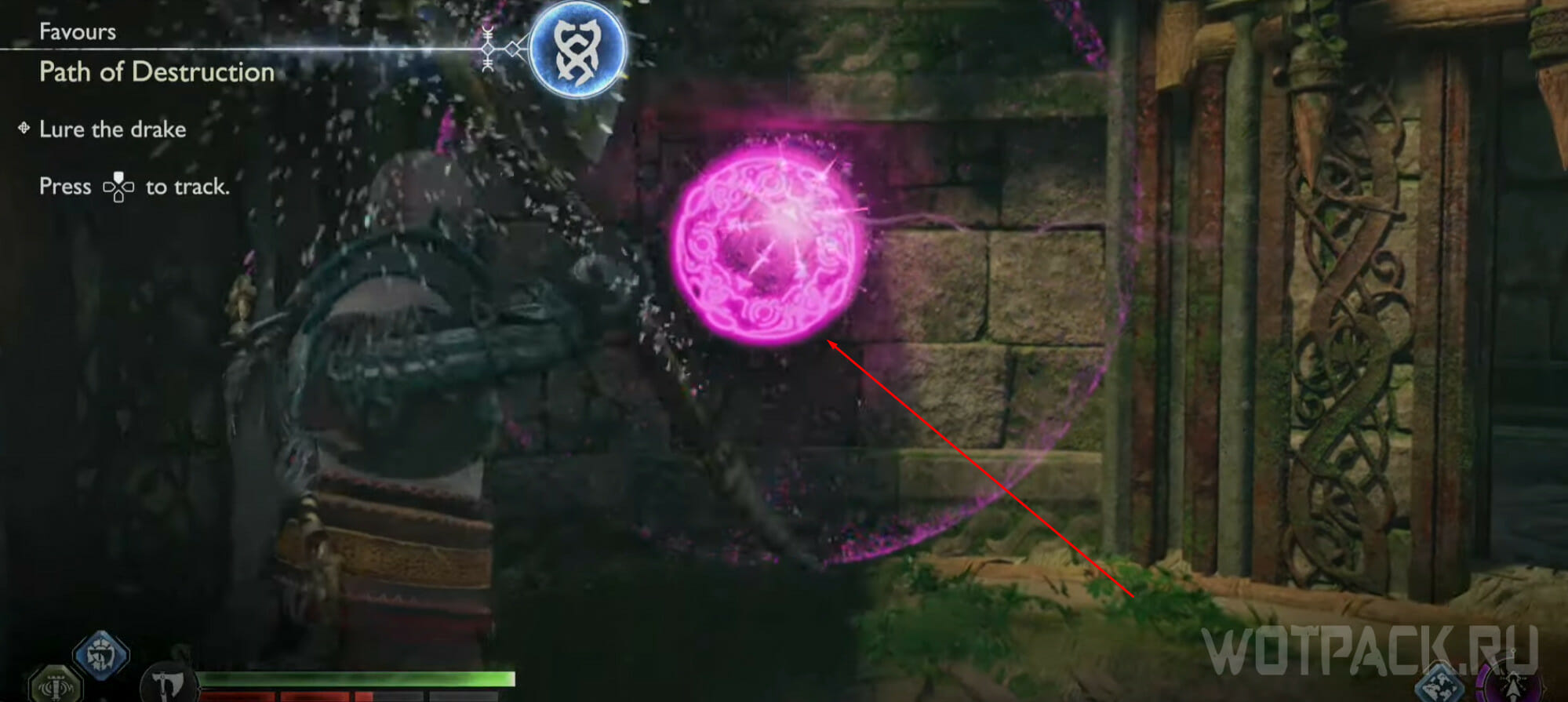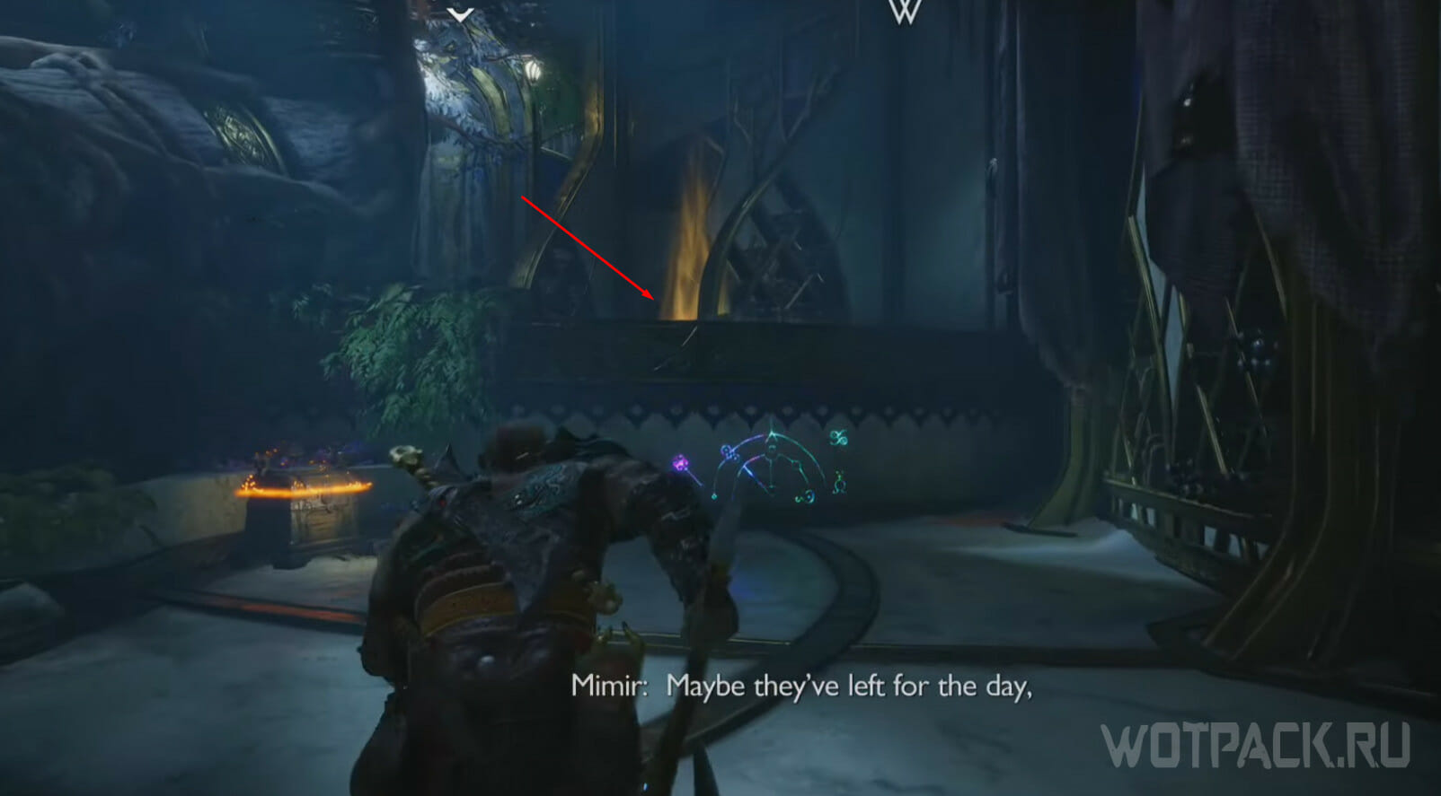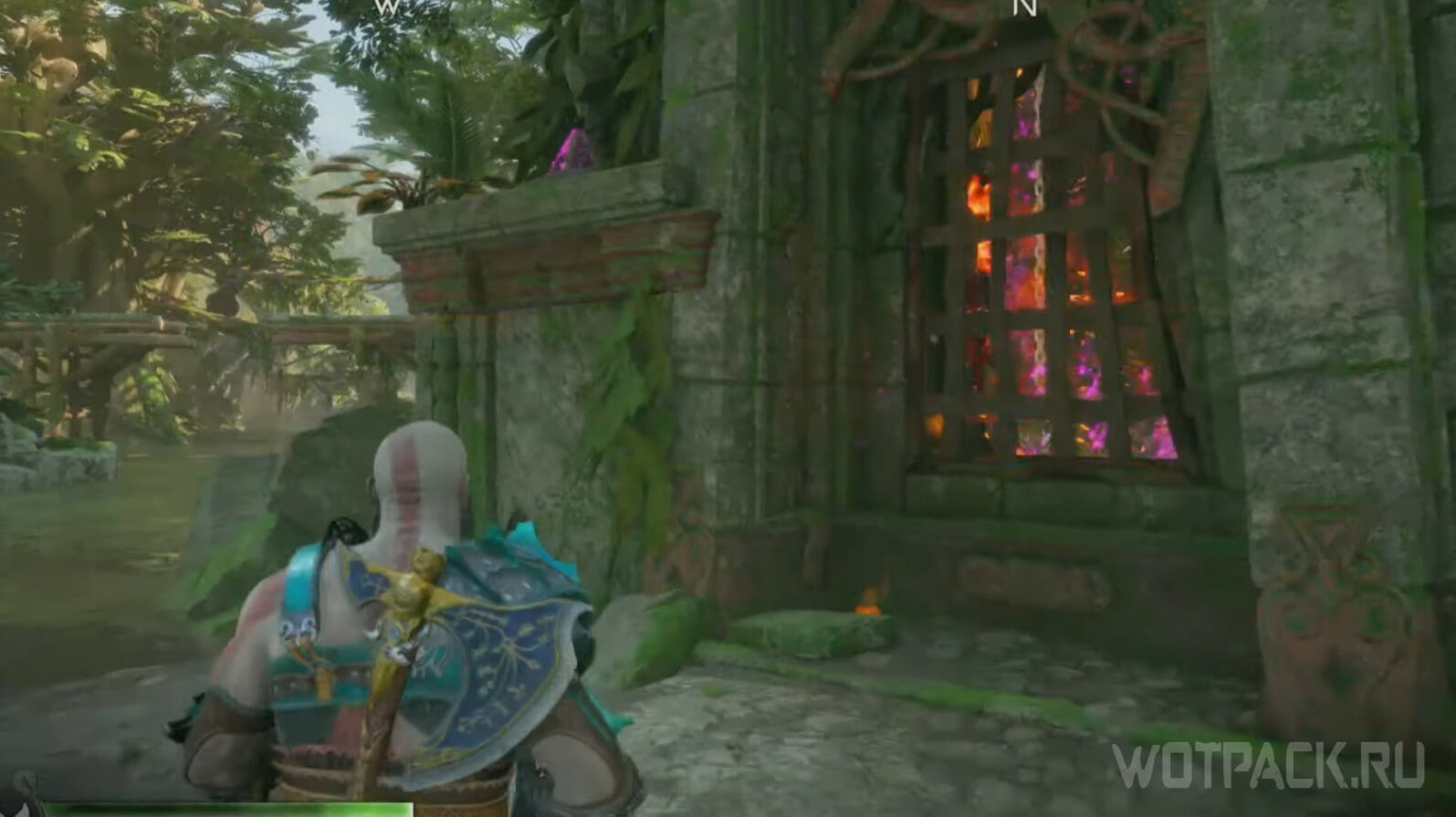 Обойдите строение слева и подойдите к месту, где находится окно, из которого видна лоза. Попросите Фрейю выстрелить в стену несколько раз, чтобы появилась рунная печать. При помощи Клинков Хаоса подожгите ее и уничтожьте растения внутри.