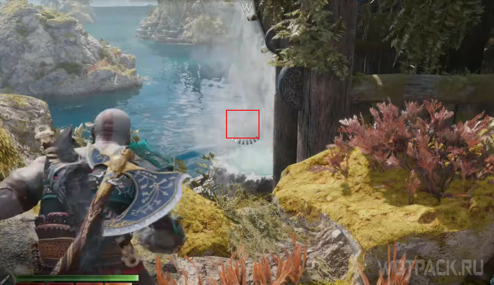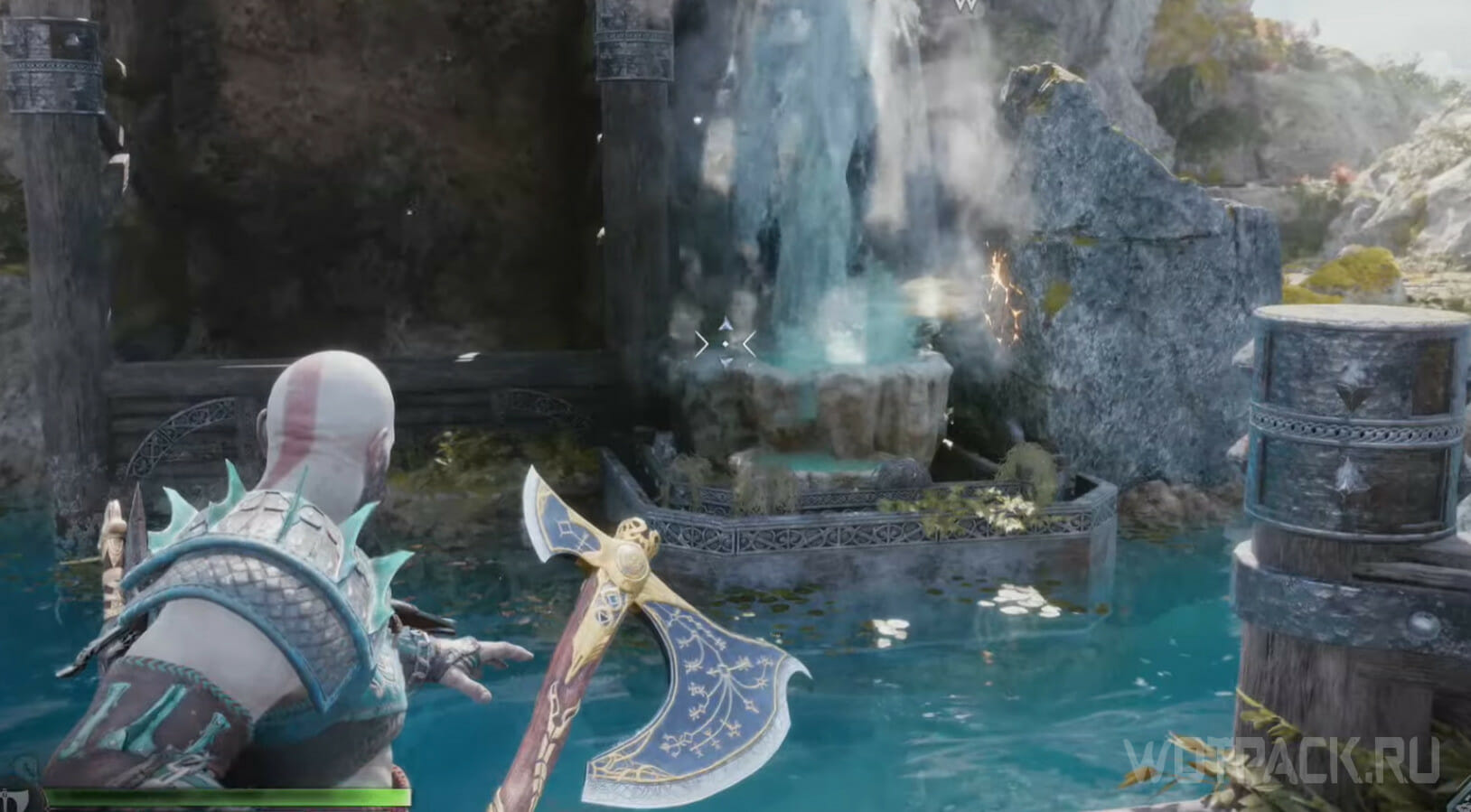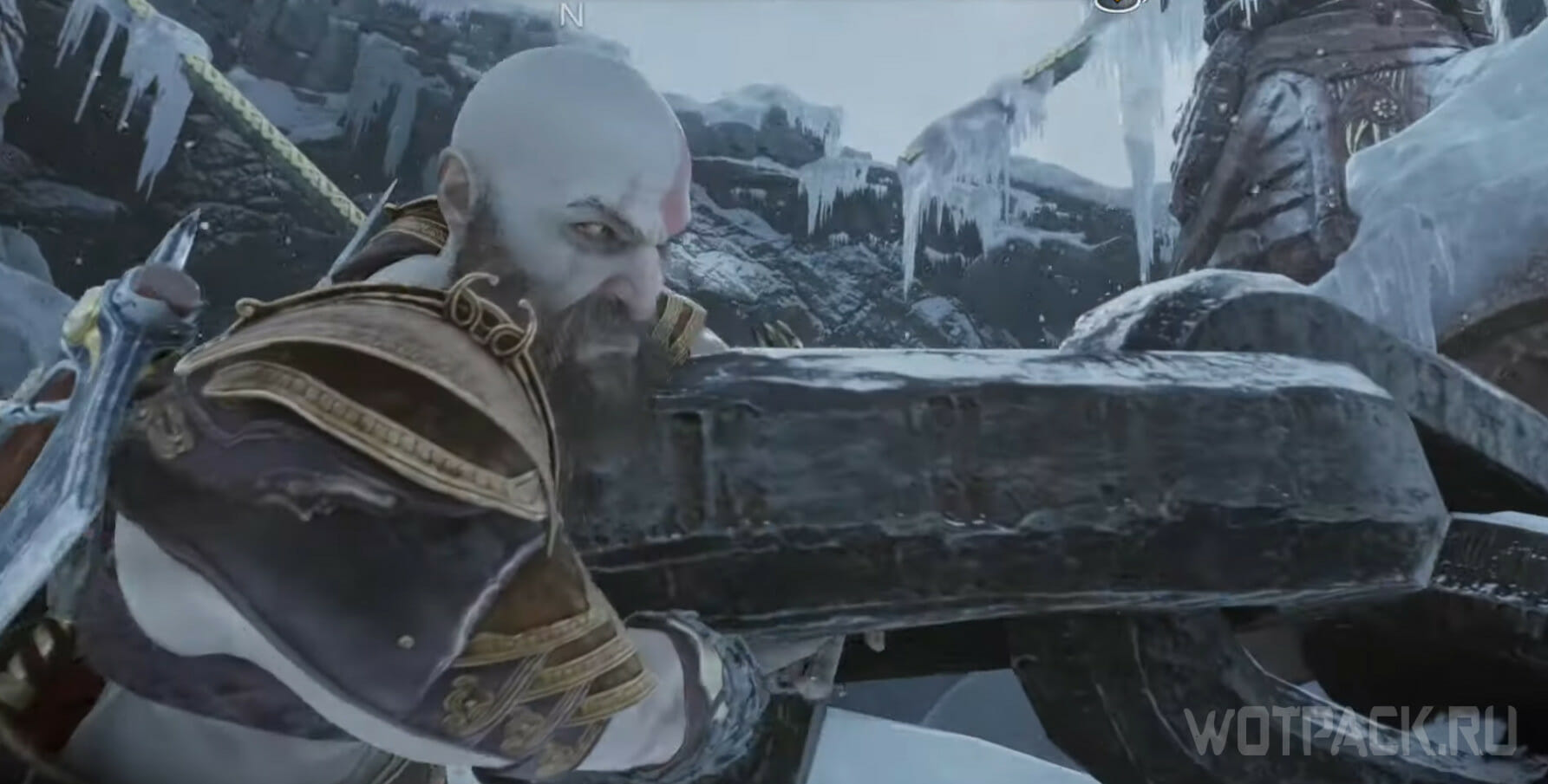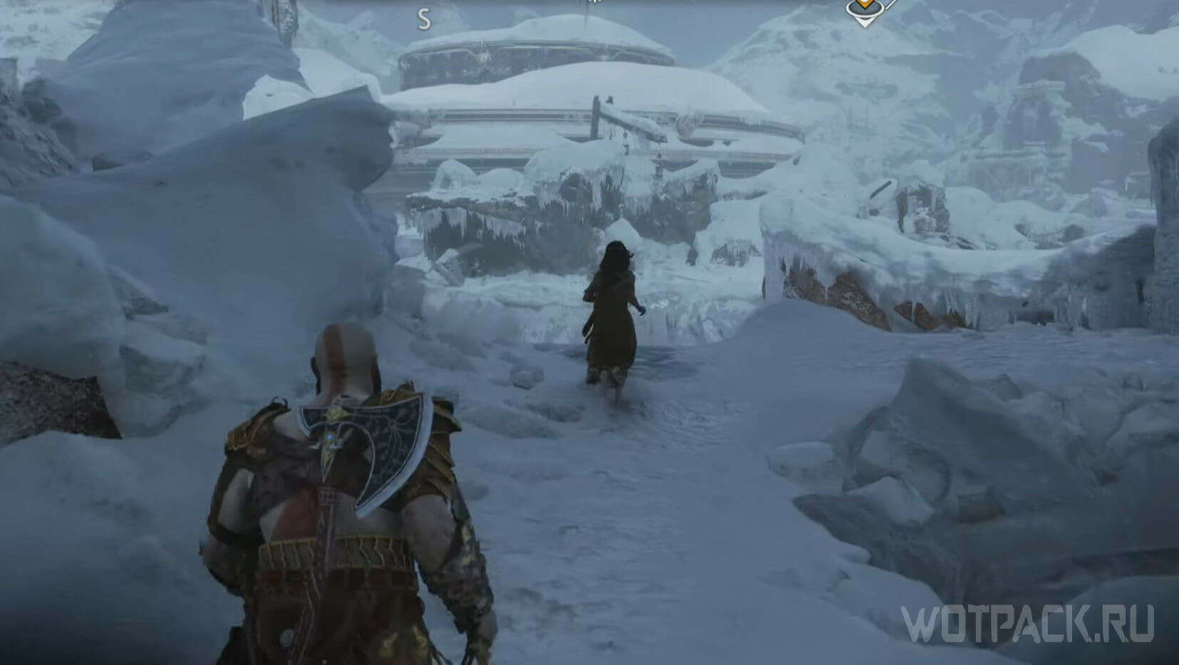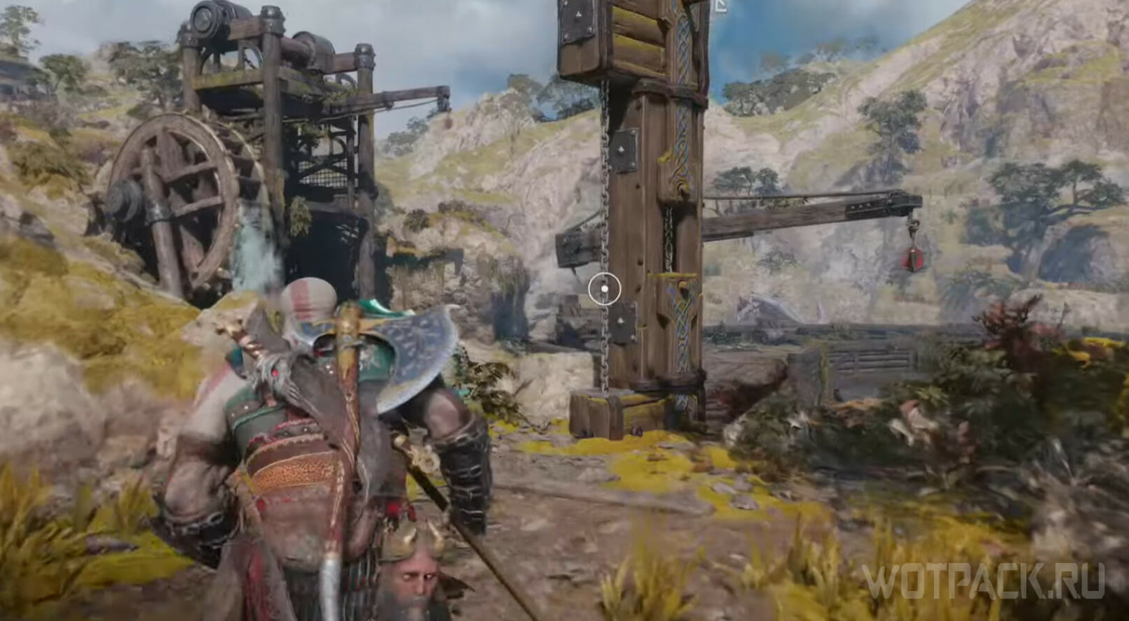 Спрыгните в колодец, расположенный по центру. Оказавшись внизу, запустите топор во вращающийся столб (в белую его часть), чтобы поднять механизм вверх. Попросите Фрейю выстрелить рунической стрелой в шестерню под столбом и бросьте туда топор, чтобы заморозить конструкцию.