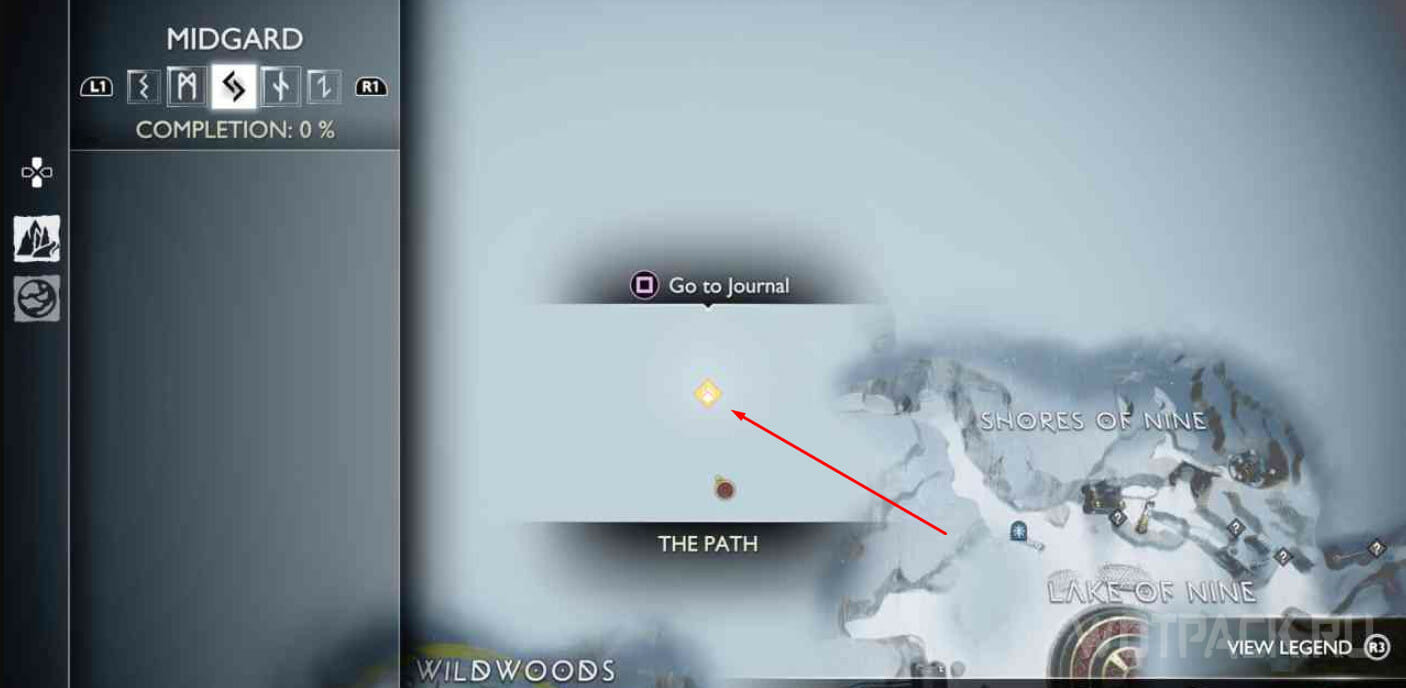 Самоцвет лежит в сундуке, спрятанном в Мидгарде, в локации Гребцы. Кратос окажется здесь во время выполнения главы «Слово судьбы«. От замерзшего Озера Девяти пробегите в сторону нужной области, пробегите через помещение под Гребцами с сундуком Норн и выберитесь через отверстие в потолке.