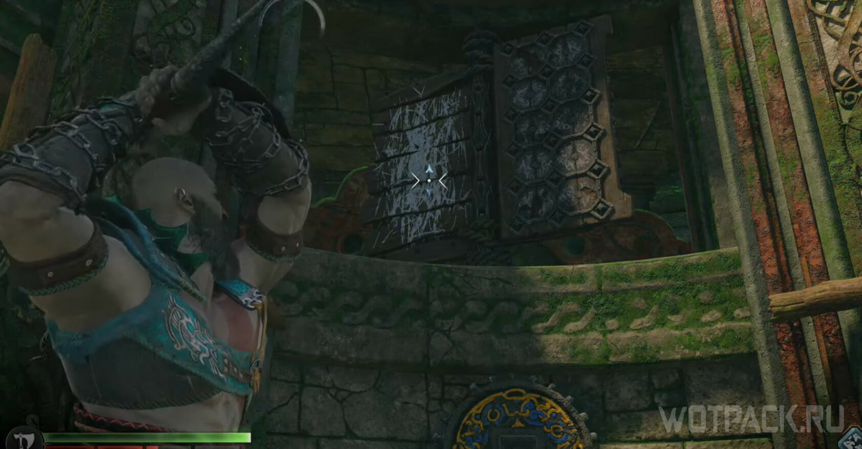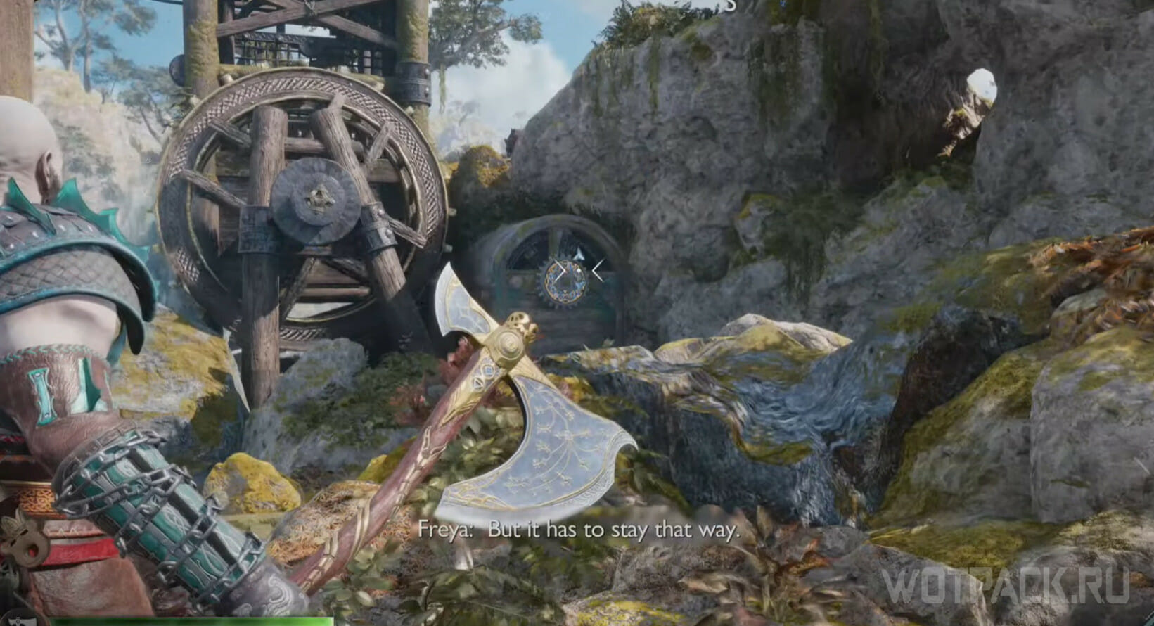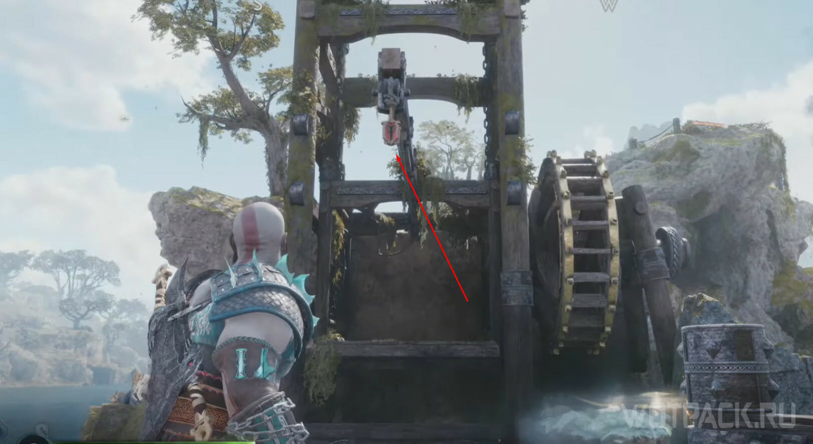 Попав на другую сторону, сверните направо и поднимитесь на выступ. Дойдите до цепи и потяните ее вниз, чтобы опустить ворота. После этого попросите Фрейю выстрелить рунической стрелой в шестеренку и метните в механизм топор для остановки.