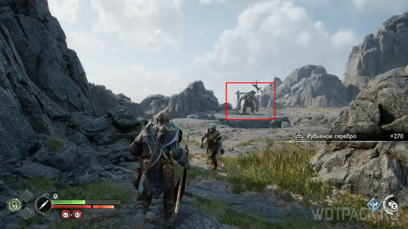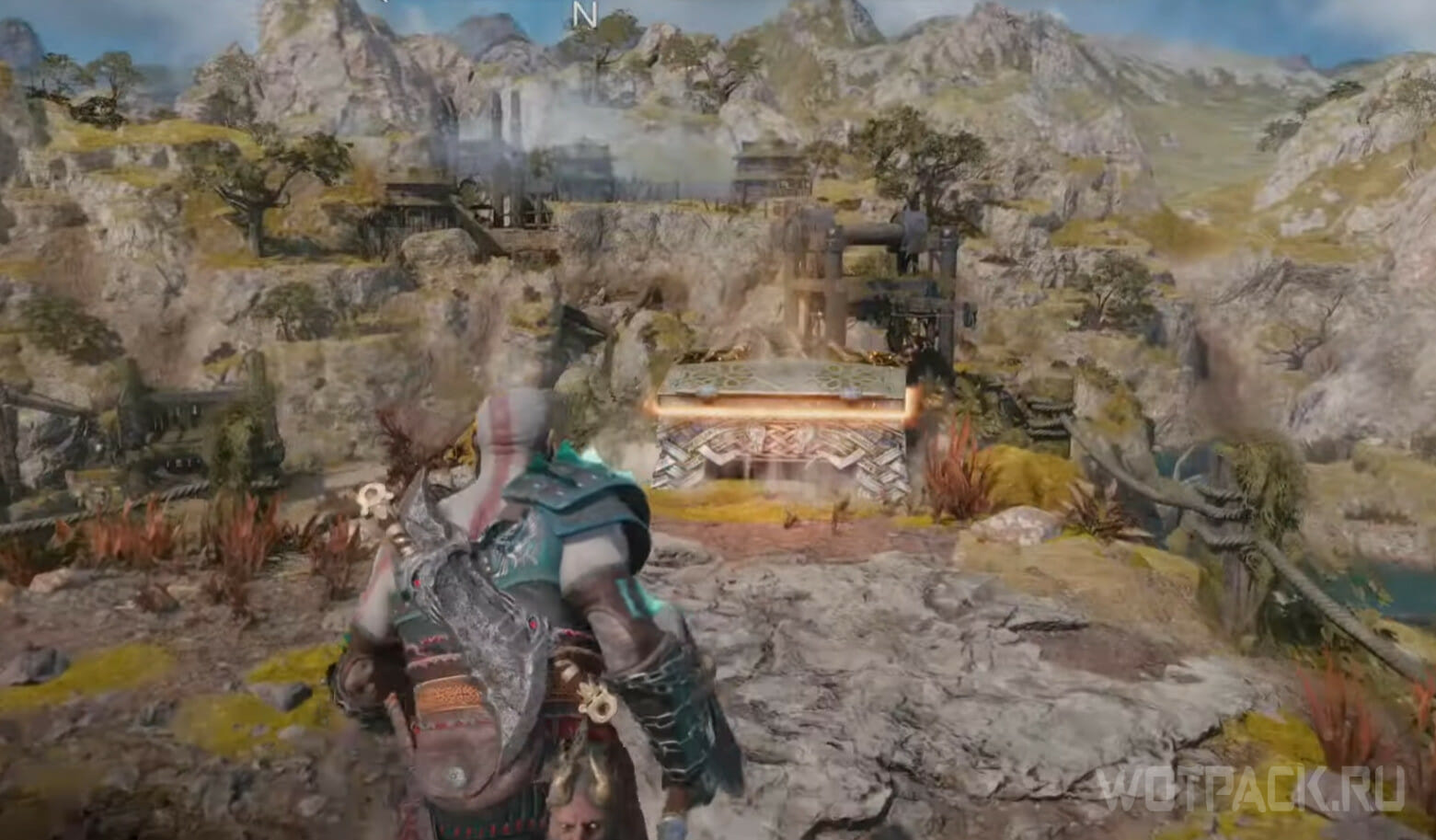 Вернитесь к первому окну и бросьте топор в механизм, удерживающий цепь. Груз опустится и откроет ворота, позволив Кратосу войти внутрь. На алтаре справа стоит сундук с самоцветом.