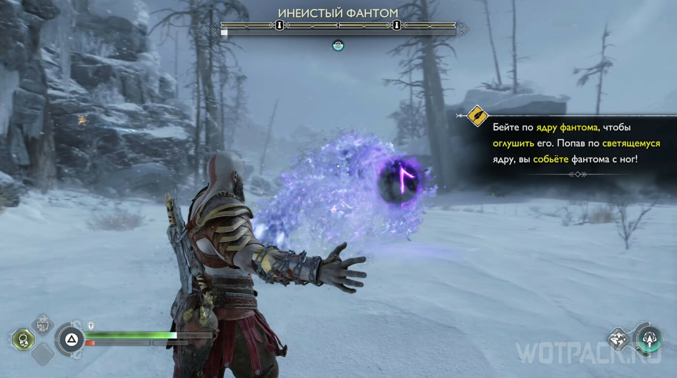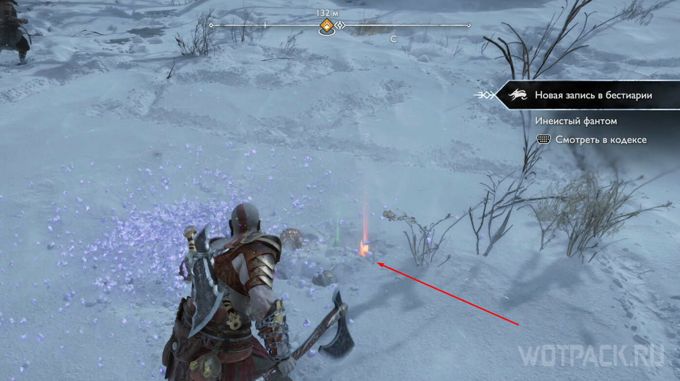 Первый самоцвет удастся найти в Мидгарде, во время прохождения сюжета. Дойдя до главы Слово судьбы, Кратосу придется сразиться с боссом Инеистый фантом, представляющим собой блуждающую магию.