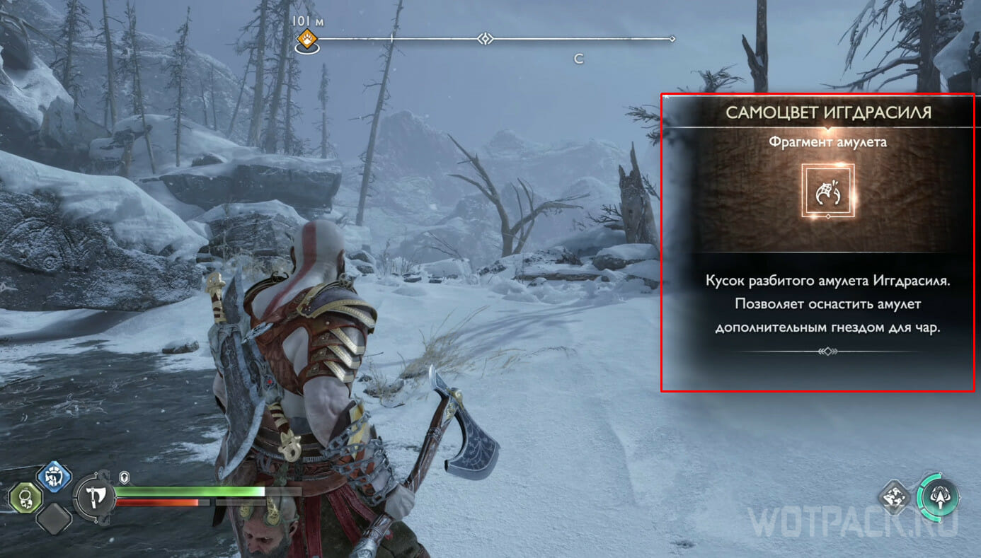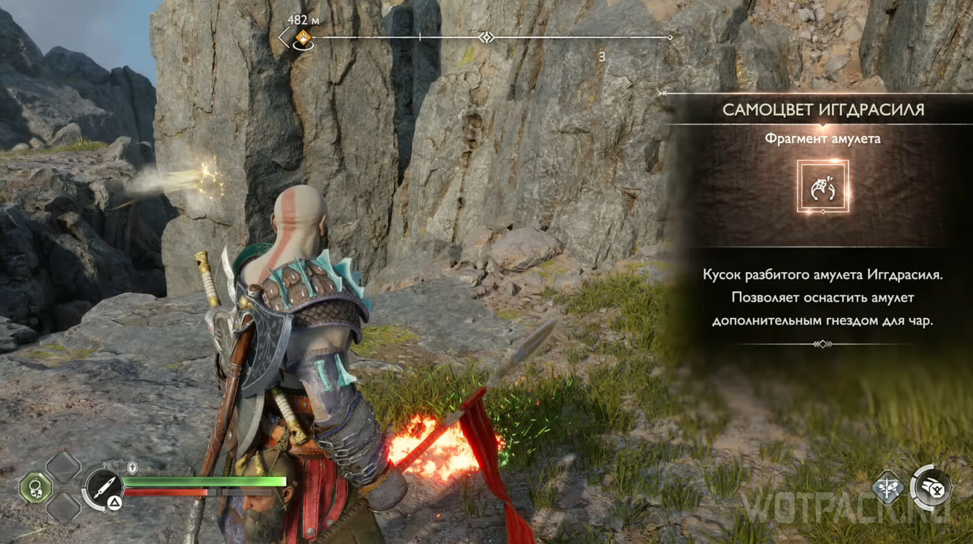 Сам амулет станет доступен после победы над Нидхегг в 6 главе сюжета – Расплата. Для его починки нужно отнести самоцвет к кузнецу. Предмет снаряжения полезен возможностью вставлять в него чары, позволяющие пассивно повышать характеристики Кратоса.