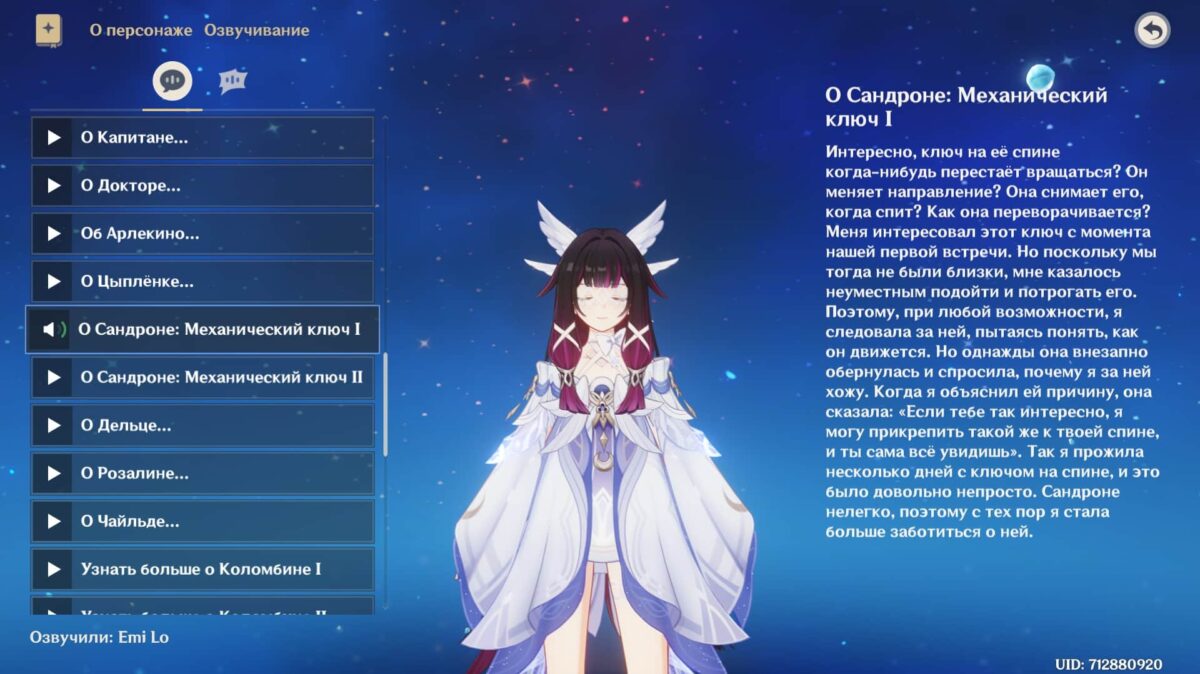 Бывший шестой Предвестник Скарамучча, теперь известный под именем Странник, описывает характер Марионетки как ужасный, а её достижения в науке весьма посредственные. |