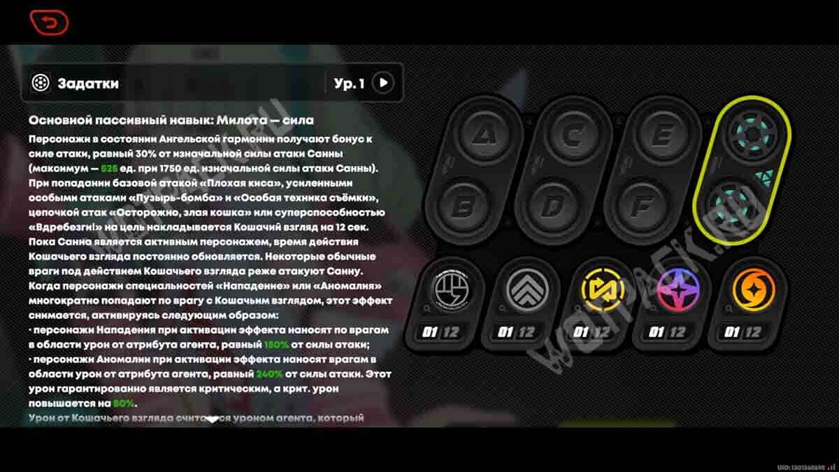 - Основная пассивная способность: «Ангельская гармония» даёт персонажам бонус силы атаки, соразмерный 30% от АТК девушки. Б/а, усиленный особый навык, ц/а и ульт накладывают на врагов «Кошачий взгляд» на 12 сек. После нескольких попаданий союзников этот статус «взрывается», а его урон зависит от специализации атаковавшего персонажа: Нападение нанесет 300% от АТК, а Аномалия — 480% от АТК (попадание гарантированно критическое с крит. уроном в 150%).