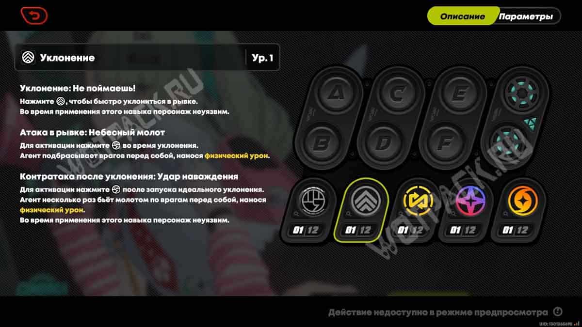 - Уклонение: стандартный набор приёмов для избегания вражеских попаданий.