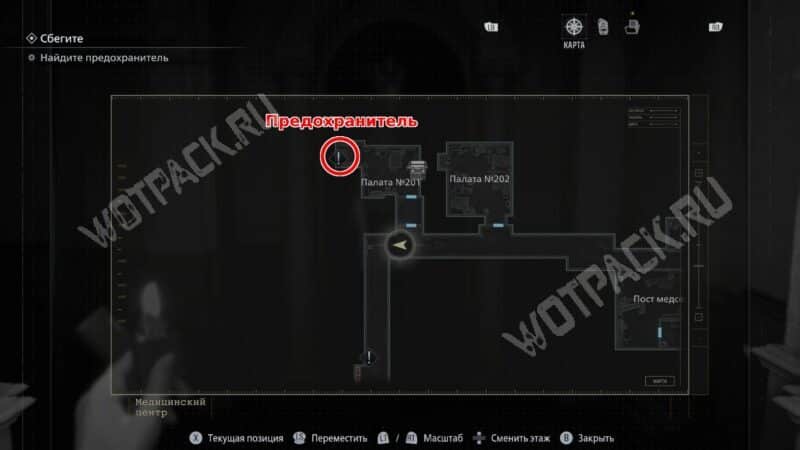 Пройдите до конца коридора, мимо палаты 202 и двери с ангелами. В конце обнаружите решётку, переключатель для её открытия и короб с отсутствующим предохранителем. Из ящика тумбочки возьмите ключ с ангелом.