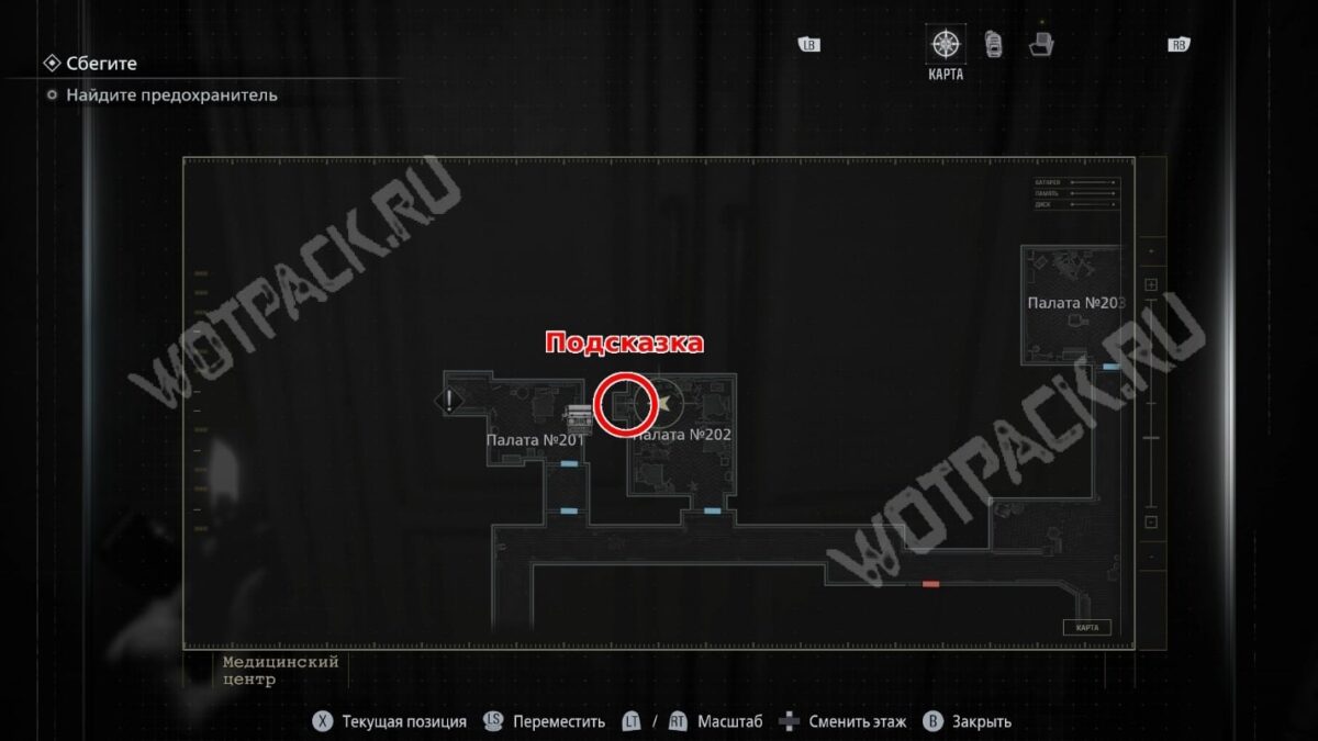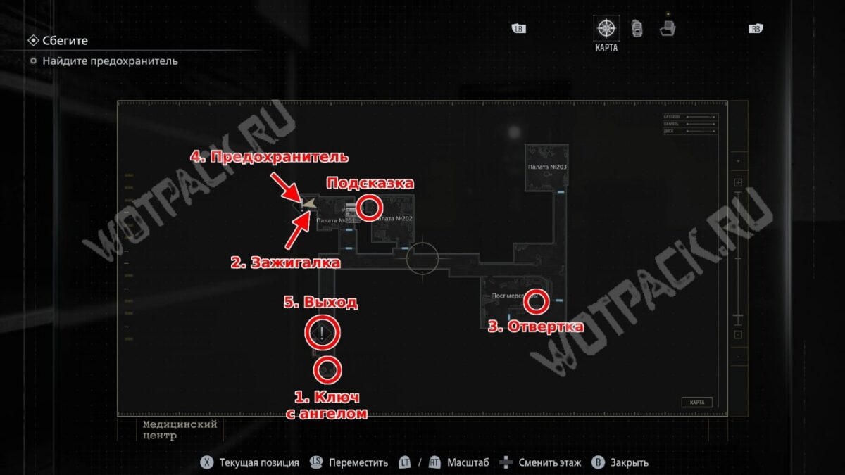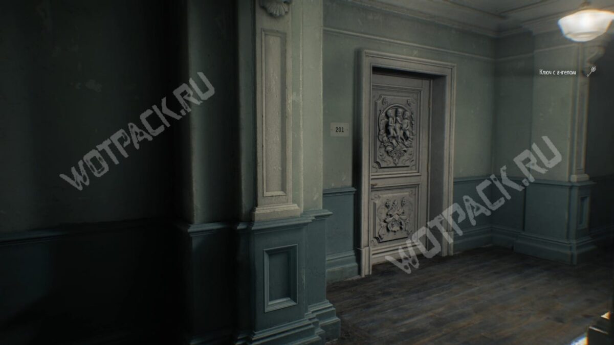 Пройдите до конца коридора, мимо палаты 202 и двери с ангелами. В конце обнаружите решётку, переключатель для её открытия и короб с отсутствующим предохранителем. Из ящика тумбочки возьмите ключ с ангелом.