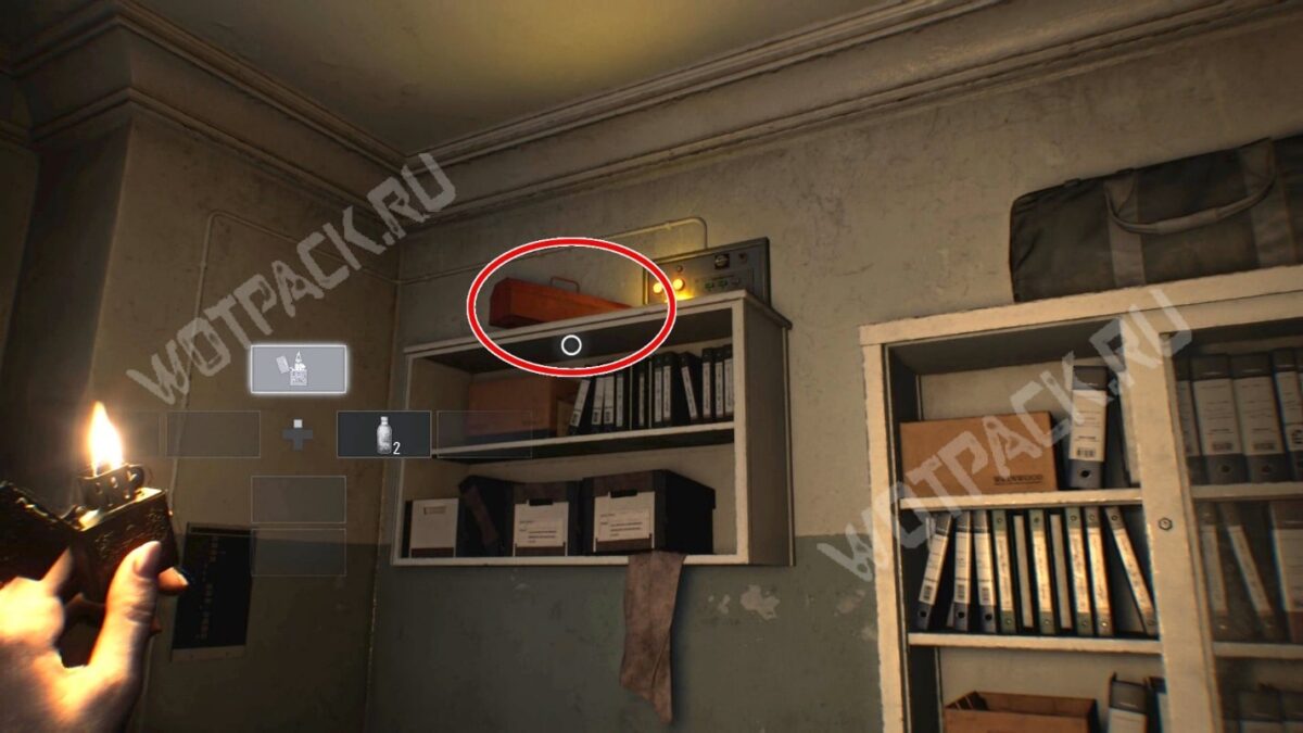 Вернитесь к палате 201 и откройте её каменным ключом. В комнате найдёте печатную машинку для сохранения и зажигалку. С её помощью вы сможете видеть в темноте и проходить в ранее недоступные помещения.