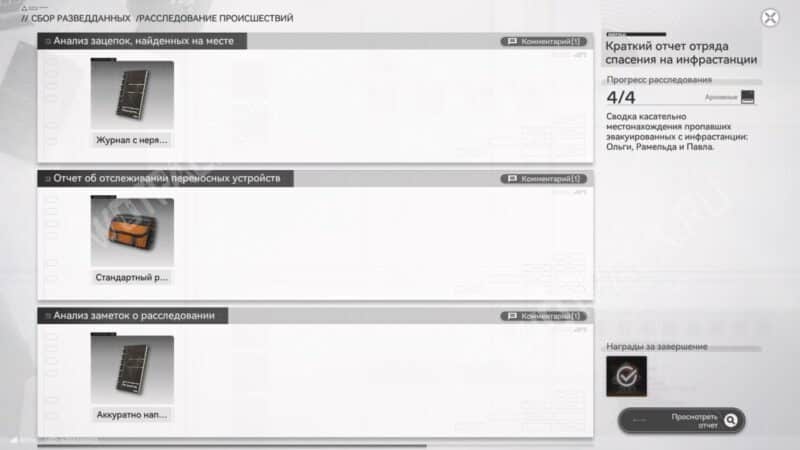 Откройте меню паузы и найдите «Архив» на правой панели, в который попадают все зацепки. Внутри вкладки «Сбор разведданных» находится до восьми папок с отчетами, которые предстоит заполнить.