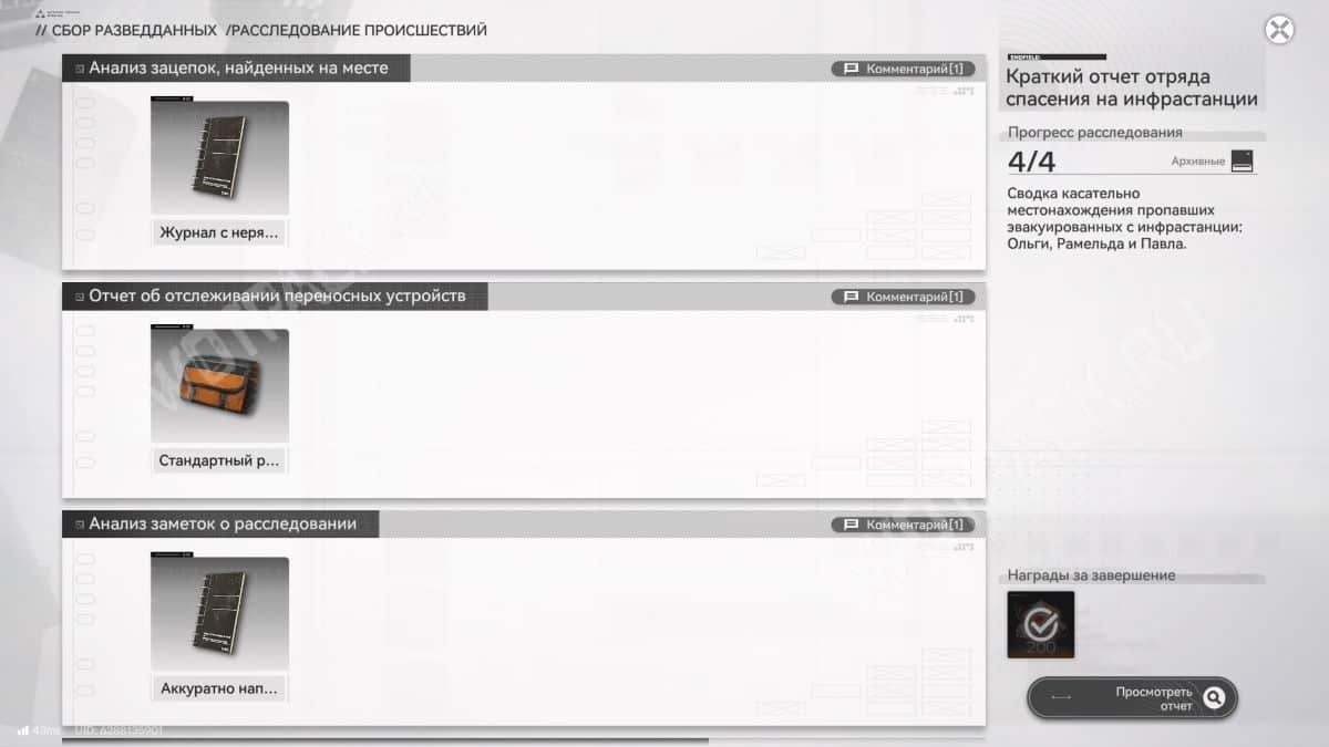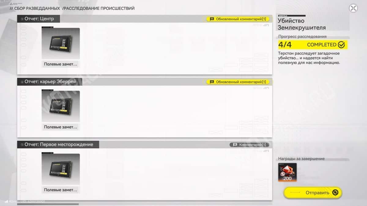 Четыре отчета выдаются за прохождение квестов из цепочки «Надвигающаяся буря»: