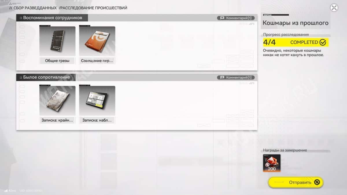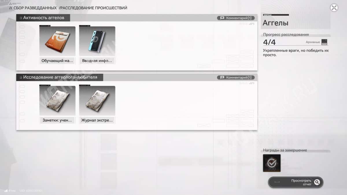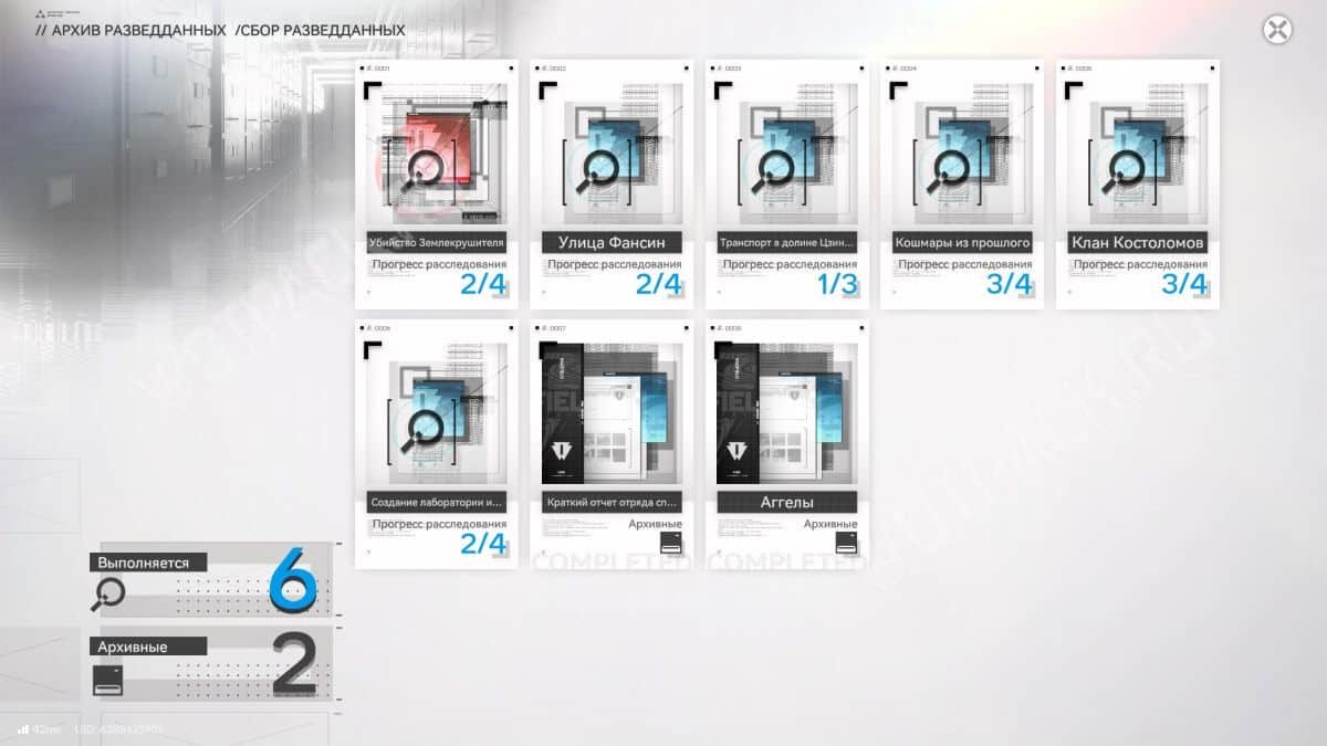 Откройте меню паузы и найдите «Архив» на правой панели, в который попадают все зацепки. Внутри вкладки «Сбор разведданных» находится до восьми папок с отчетами, которые предстоит заполнить.